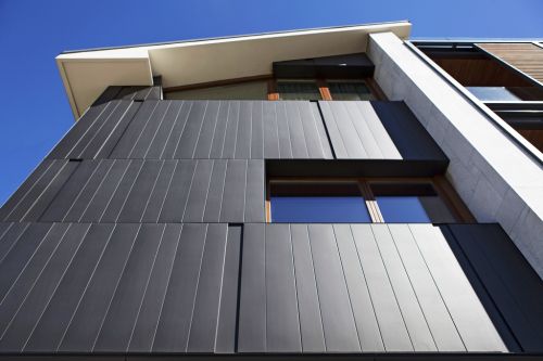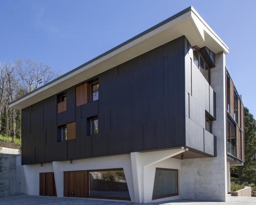 Un contesto di pregio, quello delle colline torinesi, per questo intervento di riqualificazione di una villa plurifamiliare che assume un nuovo volto grazie alle facciate rivestite in zinco titanio VMZINC abbinato a materiali nobili come il marmo di Carrara e il mogano Meranti. Distanza e irrinunciabile connessione con la città più densamente abitata. Tra permanenze e trasformazioni, la struttura e l’immagine della residenza collinare torinese sono state segnate negli anni da questa dicotomia; la connessione è visiva e funzionale, la distanza verticale e psicologica. Lo studio torinese mg2architetture ha indagato lucidamente sugli stili di vita in un contesto ambientale di pregio, a partire da un frammento di urbanizzazione collinare risalente alla seconda metà del Novecento. In questo intervento residenziale sul costruito viene sperimentata una strategia di frazionamento, densificazione e radicamento, introducendo una varietà di moduli abitativi ed esaltando la tensione fisica e visiva tra edificio e paesaggio. Il preesistente blocco residenziale si articolava su quattro piani fuori terra, con struttura in cemento armato e copertura doppia falda a pendenze sfalsate; alcuni archetipi costruttivi ascrivono l’edificio alle realizzazioni architettoniche degli anni Cinquanta e Sessanta. Caratterizzanti i tre setti a tutta altezza rivestiti in marmo di Carrara, le fasce di balconi sovrapposte e i terrazzamenti verdi in affaccio sul parco fluviale del Po. Tecnologie costruttive e consistenza materica degli spazi Setti portanti in cemento armato a vista e un taglio vetrato a tutta altezza definiscono il nucleo centrale scala-ascensore, vera e propria dorsale dei percorsi interni. Vengono preservate le falde (a eccezione di quella sud alla quale si sostituisce un terrazzo panoramico) ed enfatizzati i tre setti in marmo bianco, come traccia dell’originaria consistenza materica ed elementi ordinatori della rinnovata concezione volumetrica. La sofisticazione tecnologica dell’involucro riconduce un organismo inizialmente frammentato e incoerente a un’unità visiva di geometrie integrate e riconoscibili. Pannelli in lamiera di zinco titanio VMZINC si compongono sovrapposti con differenti altezze, vibrando e ritmando i prospetti su toni scuri e metallici. Nelle terrazze orientate a sud-ovest i pannelli brise-soleil scorrevoli su telai rendono dinamica l’alternanza di pieni e vuoti nelle facciate; il confine tra volume edilizio e spazio esterno diventa più rarefatto nel terrazzo a est, dove il lungo parapetto in cristallo è quasi invisibile e la fascia rivestita in pregiatissimo legno di mogano Meranti spezza orizzontalmente la continuità delle superfici in lamiera. «L’esigenza di intervenire sul costruito, nella quale l’unico materiale mantenuto nel progetto fosse il marmo bianco di Carrara dei setti – spiegano gli architetti Paolo Mariani, Alessandro e Fabio Guida, soci di mg2architetture –, ha indirizzato la scelta verso un materiale dalla spiccata connotazione contemporanea sia materica che cromatica. L’esigenza di individuare un rivestimento senza soluzione di continuità e che allo stesso tempo vibrasse alla luce come un materiale naturale ha portato all’utilizzo del laminato in zinco titanio VMZINC nella variante cromatica ANTHRA-ZINC. Per accentuare il gioco di riflessi di luce e ombre il materiale è stato posato a doghe verticali di quattro larghezze differenti su corsi orizzontali di diverse altezze per valorizzare le geometrie delle specchiature e dei volumi. Alcune doghe sono state montate in “negativo” creando una sorta di basso rilievo per rendere ancora più dinamico il ritmo della facciata disegnata grazie a ogni suo singolo elemento». copyright foto: Pier Mario Ruggeri Consiglia questo comunicato ai tuoi amici