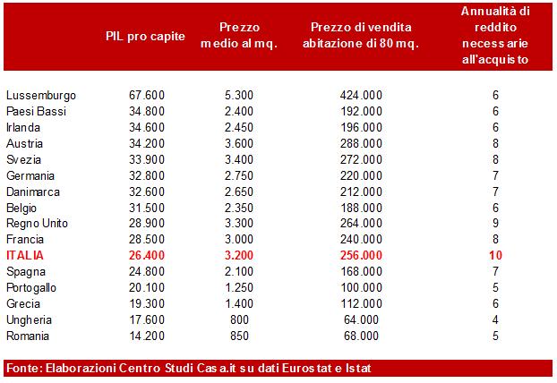 Acquistare una abitazione, per gli italiani, è un vero e proprio percorso di guerra rispetto a francesi, tedeschi, britannici e spagnoli, nonostante la discesa dei prezzi sul mercato immobiliare nazionale che da almeno tre anni si è acuita particolarmente (-6,8% nel 2014 rispetto al 2013): questo è quanto emerge da un’indagine comparativa coi mercati immobiliari dei paesi dell’Unione Europea realizzata dal Centro Studi del portale immobiliare Casa.it. L’amore per il mattone nel nostro Paese è radicato sin dagli anni del dopoguerra, ma oggi, per chi ha meno di 30 anni è molto arduo far scoppiare la scintilla. Infatti, sappiamo che il 68,7% degli italiani risulta proprietario di casa (Rapporto 2014 della BCE sulla ricchezza e i consumi delle famiglie dell’area dell’Euro) contro una media eurozona del 60%; ma di tutti questi proprietari solo il 4% sono under 30 (fonte Agenzia Entrate). Tuttavia l’indagine svolta da Casa.it punta il dito sui fattori squisitamente economici che rendono possibile una macroscopica incongruenza, e cioè che comprare casa in metropoli decisamente costose come Parigi, Londra o New York sia relativamente più facile e indolore che nelle nostre città. Alla base di tutto viene indicata la capacità di spesa inferiore degli italiani, ovverosia retribuzioni medie troppo basse rispetto ai prezzi, pur ribassati, del mercato immobiliare. Da questo punto di vista, il confronto con i nostri vicini europei è impietoso. Con un PIL procapite di circa 26.400 Euro (dati ISTAT), un italiano che voglia diventare proprietario di una casa di 80 mq, valutata intorno ai 176.000 Euro, dovrà immolare alla causa non meno di 10 annualità. In Francia, dove i prezzi delle case sono leggermente più bassi che da noi, le annualità sono due in meno. In UK, dove il prezzo al mq. è più alto, gli anni sono 9. Se guardiamo ai Paesi mediterranei a noi vicini (i famosi PIGS) il confronto è ancora più “irritante”: in Spagna il numero delle annualità da sacrificare è 7, in Portogallo sono solo 5, in Grecia, 6. La musica non cambia spostando il confronto sulle città al top del mercato immobiliare nei singoli Paesi. Coprire il prezzo d’acquisto di un’unità immobiliare da 80 mq nelle zone centrali di pregio di Roma o Milano, infatti, comporta per le finanze dell’italiano medio l’improponibile accantonamento di oltre 10 anni di stipendio, mentre a Berlino il sacrificio economico è limitato a 6,5 annualità. Persino nel cuore di New York, dove il prezzo medio al mq. si aggira intorno ai 21.000 Euro, le annualità da investire per completare l’acquisto sono solo 6,2. “Ci sono segnali positivi che si stanno sempre più concretizzando sul mercato immobiliare italiano – osserva Daniele Mancini, amministratore delegato di Casa.it – ma per avere il vero punto di svolta sul mercato bisogna che il nostro PIL inizi a segnare ritmi di crescita più solidi. A quel punto anche per le famiglie italiane tornare a realizzare il proprio sogno immobiliare non comporterà sacrifici di reddito così lunghi come oggi”. Consiglia questa notizia ai tuoi amici Commenta questa notizia