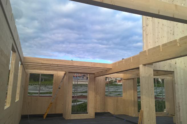 Si tratta di circa 600 mq di pareti fornite complete di 16 cm di isolante, guarnizioni di tenuta all’aria, sistemi di antirisalita dell’umidità, sistemi per il miglioramento acustico. Stessi spessori sono stati previsti per le pareti divisorie interne portanti, sempre in X-Lam a 5 strati, sempre con spessore 100 mm.