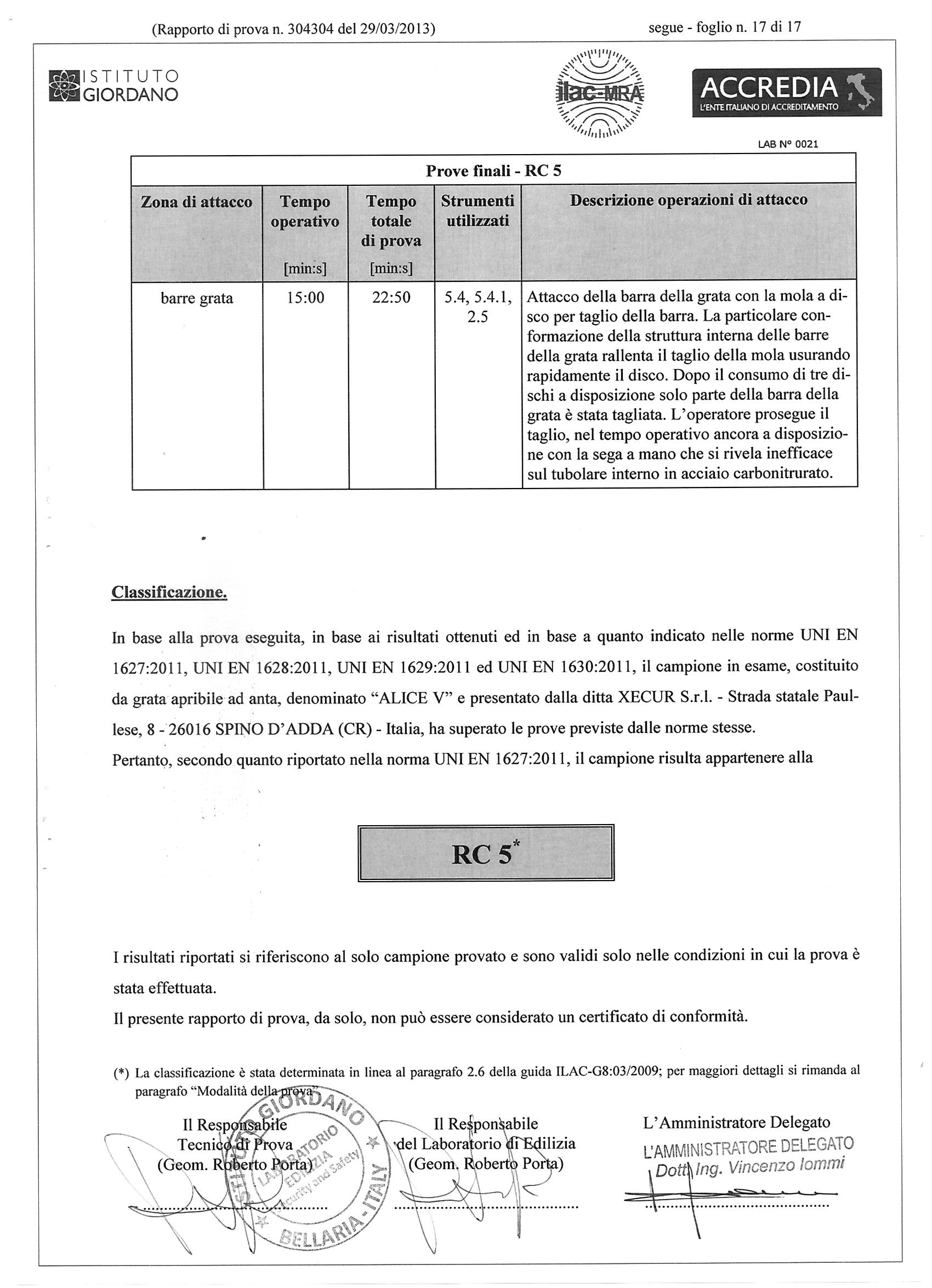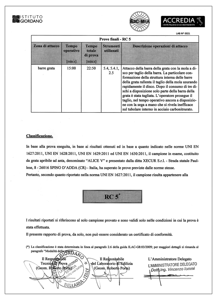 Presso un ente certificatore internazionale ha superato brillantemente una prova durata 225 minuti, di cui 75 in attacchi diretti con tutti gli strumenti di effrazione previsti.