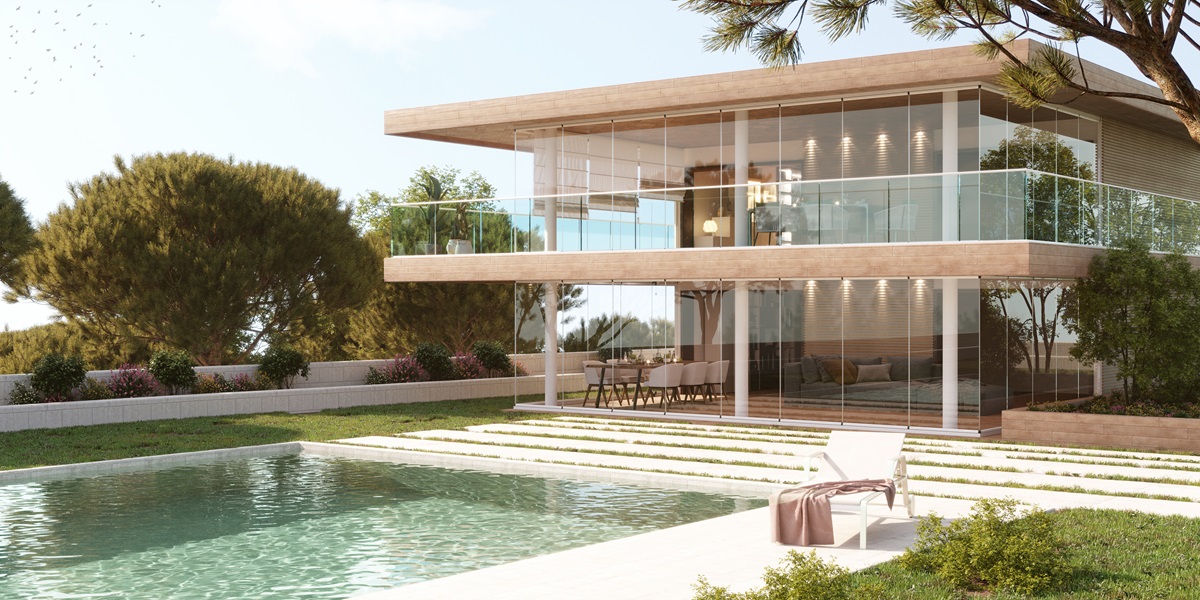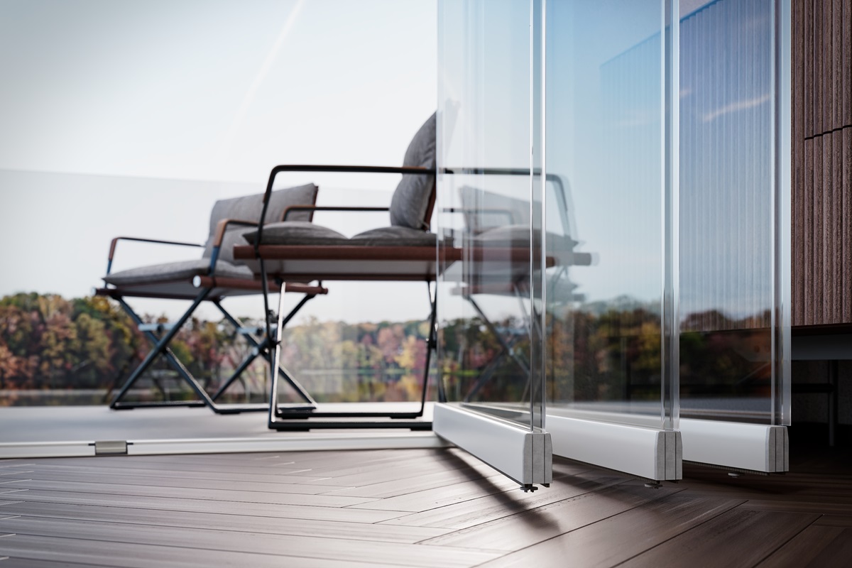 Panora: collezione di vetrate motorizzate a scorrimento verticale vetrata per locali pubblici e chiusura di terrazzi