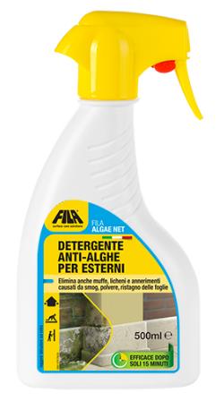 FILAALGAE NET è il detergente rapido per esterni che rimuove alghe, muffe e annerimenti risanando a fondo pareti e pavimenti in pietra naturale, cemento, cotto, mattoni faccia a vista, klinker, intonaco e pitture murali.