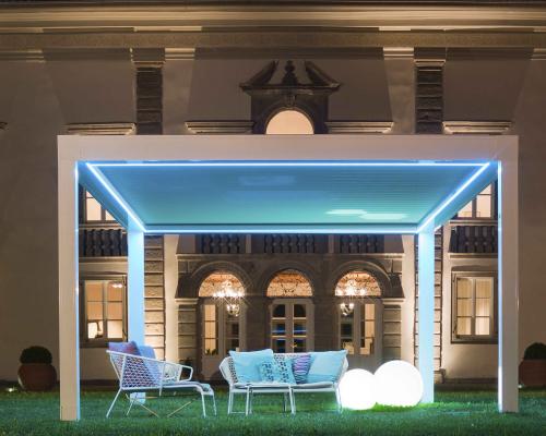 Opera presenta un design lineare ed elegante, è realizzata in alluminio e la sua copertura è composta da lame frangisole ruotabili fino a 140° per regolare luce e circolazione dell’aria.