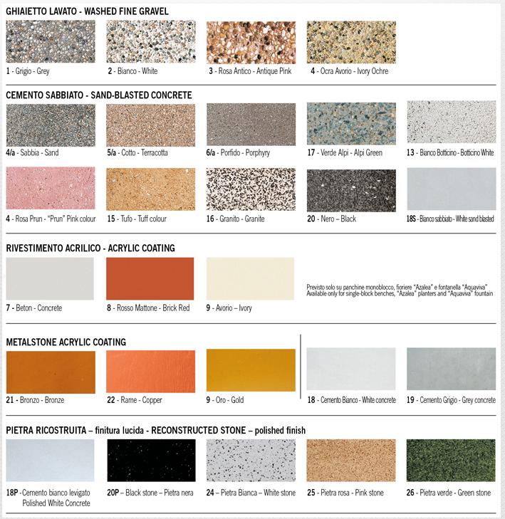 Il manufatto viene prodotto in conglomerato cementizio armato nelle colorazioni “bianco-avorio” + rivestimento acrilico trasparente oppure in rivestimento acrilico colorato come da ns. cartella colori. La seduta viene prodotta in due versioni perfettamente speculari che consentono molteplici aggregazioni riprodotte, a titolo esemplificativo ma non esaustivo, in questa pagina.