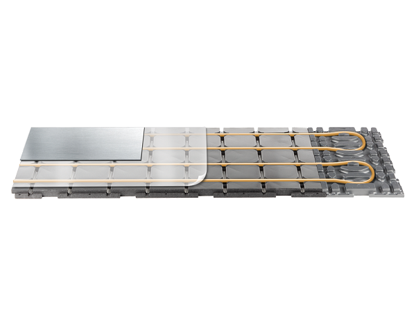 Le tubazioni, fissate grazie alle particolari scanalature vengono poi alloggiate nei canali dei pannelli per poi essere coperte da lamiere zincate, che contribuiscono ad aumentare la già elevata resistenza alla compressione del pannello e la distribuzione dei carichi superficiali.