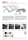 Struttura in alluminio e acciaio verniciata a polvere nel colore grigio micaceo con viteria in ottone. Pendenza per scarico delle acque verso il muro con canale di raccolta. Copertura in policarbonato 4 mm raggiato frontalmente.