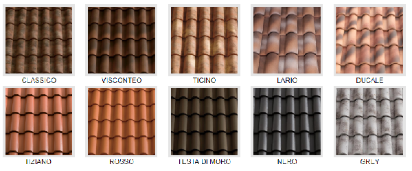 La tegola Portoghese VAL è disponibile in 10 colori: Classico, Visconteo, Ticino, Lario, Ducale, Tiziano, Rosso, Testa di moro, Nero e Grey.