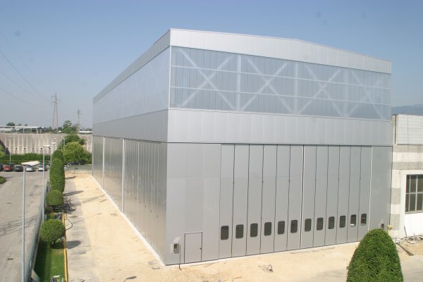 Il Portone ad impacco laterale MEGA DOOR con o senza guida inferiore , è composto da pannelli di vario spessore ( da 62 a 122mm ) , aventi telaio interno perimetrale in acciaio zincato e coibentazione , rivestiti da lamiera liscia preverniciata dello spessore di 7/10 , disponibili nei vari colori della gamma SICC .