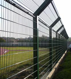 Recinzione tipo RECINTHA STADIUM in pannelli di rete elettrosaldata in tondino di acciaio Ø doppio filo 8mm più 6mm in verticale con maglia 50×200 mm, posta su sistema di pali con profilo ad omega con piatto di chiusura e bulloneria inox antifurto rispondente a quanto disposto dalle norme UNI 10121 in materia di separazione impianti sportivi. Zincata a caldo secondo UNI EN ISO 1461 e verniciata a polveri poliestere termoindurenti. Interasse piantane 2270 mm. Tipo RST1 altezza 2230mm Tipo RST2 altezza 2430 Tipo RST3 altezza 2230+630mm offendi cola a 45°. Per maggiori informazioni contattare l’ Ufficio Tecnico Nuova Defim.