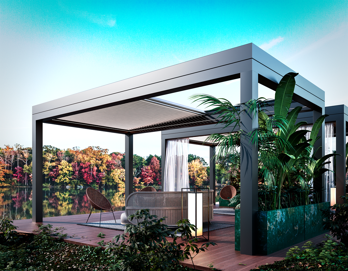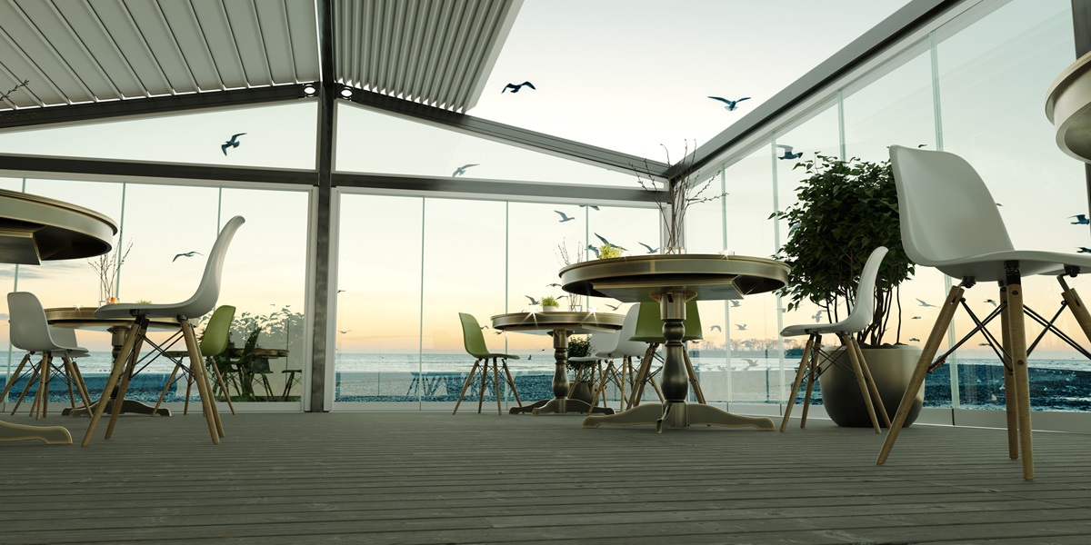 Panora: collezione di vetrate motorizzate a scorrimento verticale vetrata per locali pubblici e chiusura di terrazzi