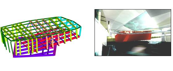 Il progetto architettonico di ampliamento della Galleria d’Arte Moderna e Contemporanea, redatto dall’Arch. Odile DECQ, presenta una notevole varietà di tipologie strutturali ed una ricca articolazione degli spazi. All’interno del progetto sono infatti previste opere fondazionali di consistente impegno, per la presenza nel progetto di uno scavo sino alla quota –13.75 m dall’attuale p.c. in adiacenza a fabbricati storici in muratura di una certa altezza (6 piani f.t.), opere in c.a. con una complessa articolazione spaziale, opere in acciaio in copertura, con luci ragguardevoli ed andamento geometrico tale da richiedere appositi studi tridimensionali, su cui afferiscono carichi utili di una certa rilevanza. Inoltre, contenuto all’interno dell’involucro dell’edificio, è presente una enucleazione spaziale rappresentata dal complesso “sala didattica e proiezioni/sala lettura” la cui tipologia strutturale è costituita da una ossatura in acciaio. Tale elemento, di significativo peso proprio ed elevati carichi utili, risulta semplicemente adagiato e parzialmente a sbalzo su di un avvallamento di 50 cm del solaio del foyer posto a quota –4.50 m. Infine, il solaio posto a quota 0.00 e posizionato sull’angolo tra Via Cagliari e Via Nizza, in cui trova collocazione l’Art Cafè, risulta sospeso, mediante pendinature, a travate metalliche reticolari vincolate ai muri preesistenti appositamente rinforzati. Il tutto è poi coronato dalle problematiche intrinseche ad operazioni di consolidamento connesse ad operazioni di ristrutturazione su edifici storici, posti sotto la tutela della Sovraintendenza ai Beni Culturali, quale l’edificio denominato “2A”, unica pre-esistenza dell’ex fabbrica Peroni ad essere mantenuta ed adeguata sismicamente dopo che la sopraggiunta nuova classificazione sismica del territorio nazionale – Ord. DPCM 20-03-2003 – ha inserito il Comune di Roma in zona 3. Modello complessivo Opere Interrate L’insieme del piano interrato è stato analizzato con modello di calcolo unico a cui sono state applicate le azioni provenienti dalle strutture soprastanti (costituendo, il solaio posto a -4,50 m, lo zero sismico del complesso). In particolare: Fondazioni Le fondazioni del corpo principale sono di tipo diretto con platea nervata. Sull’edificio “2A” le fondazioni sono state consolidate con micropali a cui sono interamente demandati i carichi pre/post intervento. Sequenza delle Fasi Costruttive dei Diaframmi/Solai Elementi contro-terra I diaframmi in c.a. (poi sostituiti in corso d’opera con berlinesi di pali) sono progettati per assorbire le azioni orizzontali derivanti dalla spinta dei terreni e dall’incremento di spinta dovuto alla presenza di edifici adiacenti. Gli elementi contro-terra assolvono anche la funzione di elemento verticale resistente vincolando le travi ed i solai di piano. Tali elementi, per la loro conformazione geometrica ed armatura, sono in grado: di ridistribuire, assieme agli impalcati di piano, spinte orizzontali non auto-equilibrate; di costituire, insieme agli altri elementi verticali (setti e pilastri), una struttura di elevata rigidezza e resistenza minimizzando le componenti flettenti (derivanti dalle azioni orizzontali) sui pilastri. Pilastri e Setti in c.a. dell’interrato I pilastri ed i setti in c.a. dell’interrato (che in corso d’opera hanno subito alcune varianti rispetto alla originaria ipotesi progettuale per il passaggio dal parcheggio meccanizzato ad un parcheggio tradizionale), costituiscono l’orditura resistente sia per i carichi verticali che per quelli orizzontali loro competenti. Travi e Solai dell’interrato I solai sono realizzati o in c.a. pieno su elementi pre-dalles o in soluzione alveolare con soletta di completamento. In particolare, il solaio posto a quota -4.50 m (realizzato in c.a. pieno su elementi pre-dalles appoggiati contro-terra, a meno della porzione centrale da cui è previsto l’accesso dei mezzi di scavo) in fase di costruzione “top-down” costituisce un efficace ritegno per la sommità dei diaframmi. Foyer/Sala Espositiva La copertura metallica del Foyer/Sala Espositiva copre una superficie di notevole estensione facendo affidamento su supporti ubicati prevalentemente lungo le pareti di confine. Le travi sono in appoggio sulle pareti in c.a. perimetrali, sui setti in c.a. interni al “foyer/sala espositiva” e sulla trave a cassone ad anello che delimita la fontana centrale. I setti in c.a. interni, a loro volta, vanno a scaricare sull’impalcato a quota -4.50 m precedentemente descritto. I sovraccarichi utili assunti per il dimensionamento della struttura di copertura, aperta al pubblico e suscettibile di grande affollamento, sono i seguenti: 500 daN/m2 di carico di esercizio in tutte le zone accessibili al pubblico; 200 daN/m2 di carico di esercizio nella zona fontana; 100 daN/m2 di carico di esercizio nella zona di copertura con elementi vetrati inclinati. La scelta strutturale prevedeva inizialmente l’impiego di travi reticolari spaziali in acciaio disposte in modo da costituire un grigliato che rispettasse l’articolazione degli spazi sottostanti. Nella fase di progettazione esecutiva, stante la sopraggiunta classificazione sismica del Comune di Roma, è stato necessario modificare notevolmente le scelte strutturali relative alla copertura e si è passati ad un grigliato di travi composte saldate a doppio T a passo di circa 4500 mm e di altezza standard intorno a 1000 mm (serie HSL e HSE). I giunti a coprigiunto tra le travi del grigliato sono concepiti e verificati come “a completo ripristino di resistenza. L’impalcato di copertura è costituito da un solaio in lamiera grecata collaborante di tipo Höesch, con estradosso posizionato alla quota del “piano del ferro”. Tale solaio è in grado di costituire ritegno torsionale per le travi a doppio T grazie alla presenza di pioli tipo Nelson dimensionati a tale scopo (nell’analisi strutturale delle