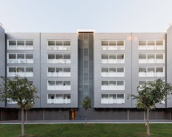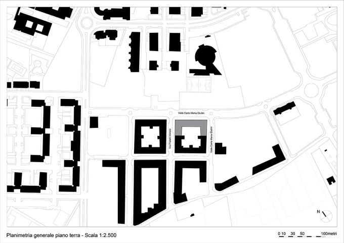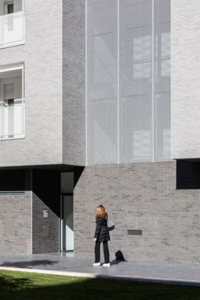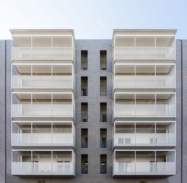 Linee rigorose, forme essenziali, colori equilibrati: un design semplice e raffinato che restituisce dignità all’edilizia residenziale di periferia. Un progetto, quello dello studio romano, che riporta al centro del dibattito architettonico il tema degli alloggi di qualità a prezzi accessibili a cura di Pietro Mezzi Indice degli argomenti: Architettura compatta e piedi per terra La qualità degli spazi Il ruolo dei balconi Le innovazioni tecnologiche La corte come un piccolo parco Con il progetto Viale Giulini Affordable Housing, lo studio Alvisi Kirimoto ripensa la periferia di Barletta attraverso un intervento di edilizia residenziale convenzionata. L’edificio, situato a sud-ovest della città, in un’area di 167, si pone l’obiettivo di raccordare la macro scala urbana con la dimensione domestica, all’interno di un più ampio sistema di progetti di rivitalizzazione del quartiere, tra cui il vicino Parco dell’Umanità e l’Asse Pedonale Attrezzato. L’area di edilizia economica e popolare di Barletta (foto, ©Marco Cappelletti) Architettura compatta e piedi per terra Lo studio romano è impegnato sul tema della rigenerazione urbana in Italia e all’estero: dal lavoro con Renzo Piano nel G124 al cantiere aperto di asilo nido, centro civico, biblioteca e parco a Grotta Perfetta nella periferia sud di Roma, all’attivazione di laboratori sperimentali nei grandi centri commerciali ai margini delle città di Nanchino e Shanghai in Cina. Per Barletta lo studio ha dato vita “a un’architettura compatta e con i piedi per terra”, come la definiscono gli architetti. Un prospetto del nuovo edificio (foto, ©Marco Cappelletti) Dal profilo sobrio e rigoroso, l’edificio si rapporta alla città in modo scultoreo, in netto contrasto con il contesto variegato e assordante in cui si inserisce, carente di spazi verdi e tipologie urbane prive di innovazione. Il complesso, formato da 50 unità abitative con i relativi parcheggi sotterranei e di un piano terra dedicato alle attività commerciali, si presenta, infatti, come un monolite a forma di C, che si sviluppa per un’altezza di sei piani e una superficie totale di oltre cinquemila metri quadrati. La pianta tipo dell’edificio (credits, Alvisi Kirimoto) La qualità degli spazi La regolarità dei prospetti rappresenta il carattere principale dell’edificio: la cortina uniforme in mattoni di colore grigio scuro diventa una sorta di partitura neutra dove, a scandire il ritmo, sono gli elementi in lamiera metallica bianca di aggetti e bucature. «Il progetto rompe con le forme tipiche dell’edilizia convenzionata – spiega Massimo Alvisi, co-fondatore dello studio . Ci interessava lavorare sulla tipologia e sulla qualità degli spazi, non solo sul disegno. Per bilanciare la gravità del volume, il cui profilo arrivando a terra si piega per ampliare lo spazio pubblico, abbiamo immaginato una serie di logge leggere e permeabili appese alla facciata, attribuendo democraticamente a tutti uno spazio in più. Le logge, infatti, da un lato si proiettano verso l’esterno, quale estensione naturale degli appartamenti, dall’altro, con le loro superfici bianche e perforate, riflettono la luce naturale all’interno dell’ambiente domestico. Inoltre, aggiungono da 10 a 15 metri quadrati in più agli appartamenti, arricchendo la qualità spaziale dei tagli tipologici più modesti e limitativi. Il ruolo dei balconi I balconi sono sporgenti su viale Giulini, per trarre il massimo beneficio dalla luce naturale, e scavati nel volume negli altri prospetti, per limitare il fenomeno dell’irraggiamento. I balconi sporgenti su viale Giulini (foto, ©Marco Cappelletti) Protetti in alto dalla pioggia e lateralmente da schermature in lamiera perforata per aumentare il livello di privacy, ospitano ai lati le infrastrutture tecnologiche e gli stenditoi. La loro conformazione permette la massima personalizzazione interna, senza mai alterare l’estetica generale delle facciate. Le innovazioni tecnologiche «Il progetto è fortemente innovativo dal punto di vista tecnologico – prosegue Alvisi -. Le soluzioni adottate rendono sia le logge interne che esterne, prefabbricate e riproducibili facilmente in serie, senza però rinunciare alla ricchezza del dettaglio e alla durabilità. Questa strategia, condivisa con l’impresa, ha permesso di fare edilizia convenzionata di qualità e di restituire una casa unica, sicura e durevole, a un budget estremamente limitato per il mercato attuale». Di giorno, quando la luce artificiale cede il passo a quella naturale, il costruito perde peso, i volumi delle logge e dei balconi diventano lievi, coniugando con la massima semplicità il materiale e la leggerezza. Anche l’attacco a terra dell’edificio trasmette solidità e dinamismo al tempo stesso: se il rivestimento parte direttamente da terra, radicando l’edificio al suolo, il piano vetrato commerciale termina sul fronte strada e sui lati corti con un taglio diagonale verticale netto, che slancia il volume. La stessa inclinazione è ripresa in orizzontale in tutti i piani nel raccordo tra i lati minori e il fronte principale, risolto con una svasatura, così come il parapetto in copertura, che nasconde i pannelli solari termici. La corte come un piccolo parco Funzionalmente l’edificio si presenta diviso in tre blocchi, ciascuno dei quali dotato di un proprio vano scala e ascensore. Il corpo scala centrale è completamente vetrato verso la corte, mentre quelli laterali sono illuminati naturalmente da un lucernario, attraverso il quale la luce filtra in tutti i livelli tramite un ampio vano vuoto, compreso tra le rampe e il vano ascensore. Il corpo scala laterale è illuminato naturalmente da un lucernario tramite un ampio vano vuoto compreso tra le rampe e il vano ascensore (foto, ©Marco Cappelletti) Tutti gli appartamenti sono organizzati attorno a una corte, che occupa una superficie superiore al 70% del lotto. Questa è pensata come un piccolo parco, do