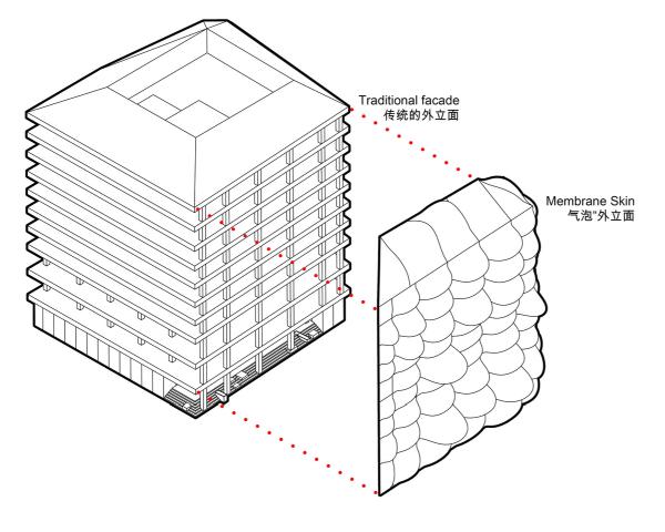 Il progetto è una ristrutturazione di un edificio comune, vecchio e poco attraente nel centro della città di Shanghai. Situato in una zona in cui si sta compiendo un grande cambiamento e dove gli edifici circostanti si stanno sviluppando, diventando più moderni e accattivanti, la strategia dei progettisti è stata quella di riuscire ad attirare clienti per affittare gli spazi ad uso ufficio ai piani superiori e commerciali ai piani inferiori. L’idea di partenza è stata quella di creare un edificio icona, una sorta di punto di riferimento molto facile da riconoscere; una sorta di scultura con un carattere forte in grado di staccarsi dal paesaggio urbano noioso. Il design è molto semplice, ma contiene qualità ambientali complesse cioè l’uso di gonfiabili di fronte ad ogni stanza; una poca differenza di pressione tra l’interno e l’esterno è sufficiente per tenere il telo gonfiato. La ventilazione dell’edificio, l’aria condizionata e il filtraggio sono centralizzate e sarà facile tenere la pressione interna necessaria anche quando si utilizzano porte e aperture tradizionali. La prima funzione della superficie bianca e traslucida curva è di amplificare la luce solare (grazie alla forma arrotondata) e concentrarla verso l’interno dove la profondità dell’edificio è molto ampia e gli spazi di lavoro sono molto distanti dalle finestre. Lo spazio d’aria tra il vetro della finestra e il gonfiabile agirà anche da isolante efficace per mantenere una temperatura interna ottimale e verrà ossigenato attraverso una barriera verde posta tra il vetro e il tessuto. Questa micro serra sarà consentirà di scambiare la pressione dell’aria con l’ufficio interno, fornendo il miglior clima in estate e in inverno. La qualità della luce sarà sempre ottimale grazie ad un sensore, che fornirà la giusta miscela tra la luce artificiale e naturale. Le bolle di facciata non costituiranno una facciata statica, ma oscilleranno con il vento e interagiranno con gli abitanti. Quando le persone non sono nella stanza il sensore passerà la ventilazione verso il minimo e la facciata diventerà quasi sgonfia. La sua forma arrotondata sarà enfatizzata quindi di giorno, mentre la notte, il materiale di facciata sarà illuminato in modo uniforme per diventare una sorta di lampada, creando essa stessa una icona urbana. La parola al progettista Quando mi sono trasferito da Roma a Shanghai ho notato molte differenze ambientali. La principale era il fatto che quando ho guardato fuori dalla finestra non ho avuto la stessa buona sensazione che mi dava Roma. E ‘stata probabilmente una combinazione di edifici grigi, il cielo perennemente plumbeo e il fatto che non si potesse aprire la finestra a causa dell’inquinamento dell’aria esterna. Ho cominciato a sentirmi più felice di notte, perché non si poteva vedere all’esterno. Essendo un meteoropatico mi considero molto sensibile ai problemi di luce, e l’unica volta che ho provato una piacevole sensazione a Shanghai è stato quando mi sono trovato sotto un lucernario con un particolare vetro smerigliato. Forse la ragione di questo veniva dal fatto che si immagina che la luce naturale che attraversa il lucernario provenga da un bel cielo sereno. Questo era esattamente l’effetto che volevo produrre in questo progetto, in cui ogni ufficio potesse sperimentare le stesse sensazioni positive che ho ricevuto io nel trovarmi sotto la luce di un magico lucernario smerigliato. Consiglia questo progetto ai tuoi amici Commenta questo progetto