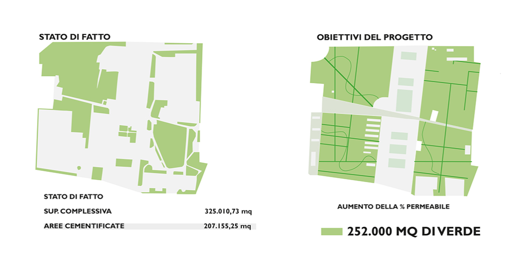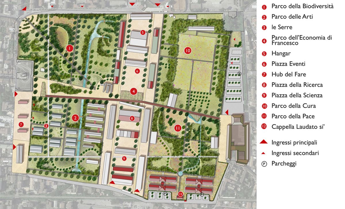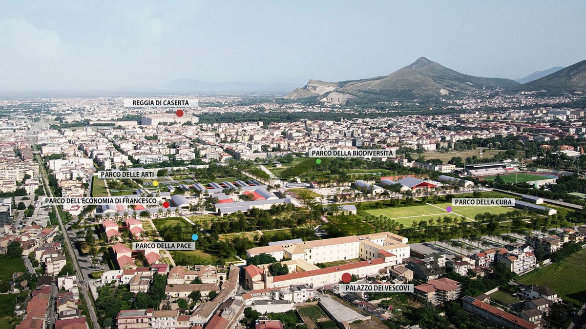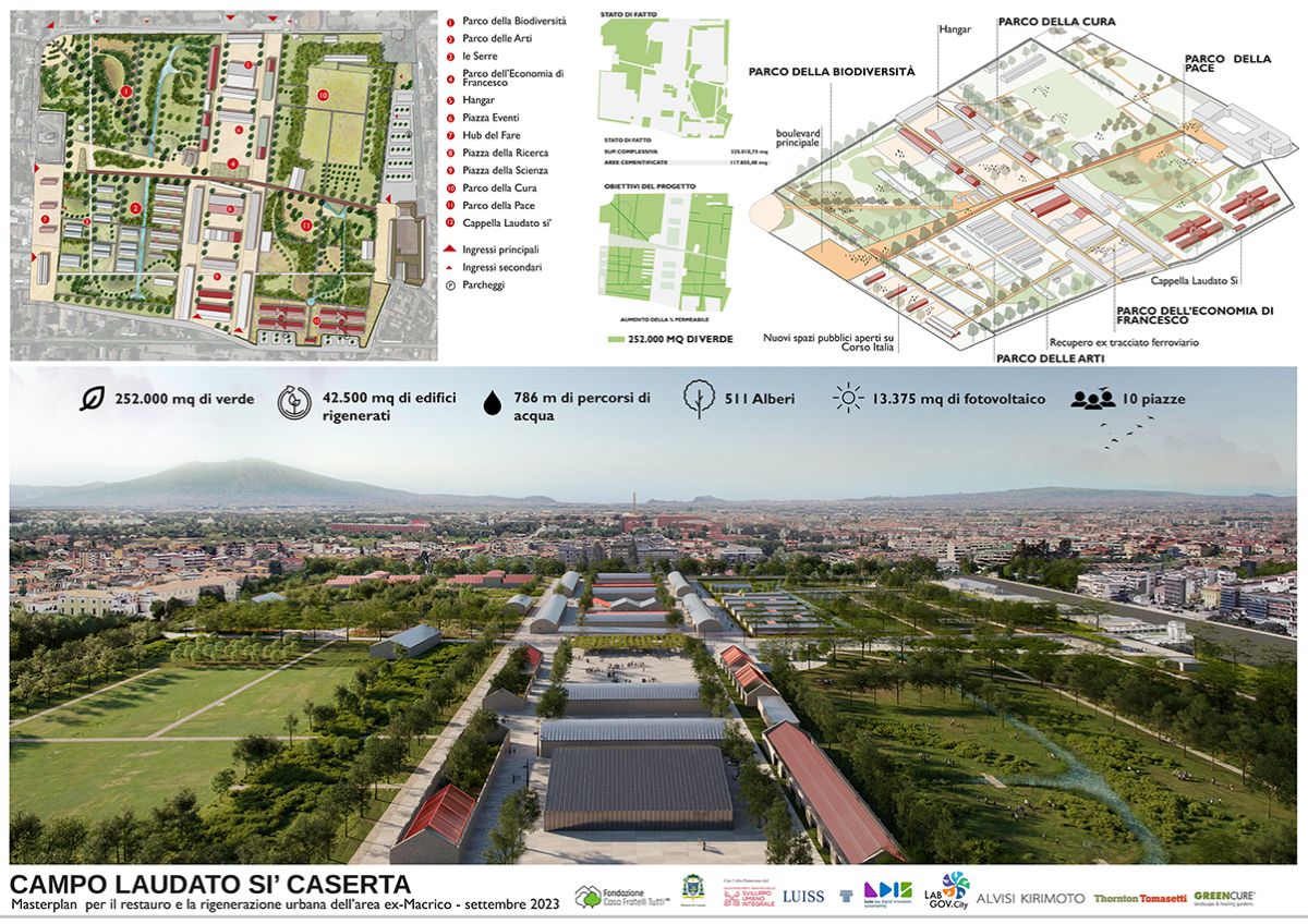 Lo studio di prefattibilità per la rigenerazione dell’area prima occupata dal Magazzino centrale rimessa mezzi corazzati della città campana porta la firma dello studio di architettura Alvisi Kirimoto. Gli oltre 300mila metri quadrati dell’area sono pensati per diventare un polo verde, sociale e culturale ispirato alla Laudato si’ di Papa Francesco A cura di: Pietro Mezzi Le principali funzioni del Campo Laudato si’ Caserta Indice degli argomenti Toggle I contenuti dello studioLe azioni previsteGli ambiti di interventoIl progetto strategicoLe possibili fonti di finanziamento A Caserta, un’area di oltre 300mila metri quadrati, non distante dal centro cittadino, potrebbe trasformarsi da ex presidio militare in un parco verde capace di ospitare funzioni sociali e culturali ispirate all’ecologia integrale di Papa Francesco. Lo studio di prefattibilità, presentato alcuni giorni fa, dal titolo “Da Campo di Marte a Campo Laudato si’ Caserta, parco verde per l’ecologia integrale, polo sociale e culturale”, nasce dalla volontà della Curia di Caserta di attivare un processo di sviluppo urbano sostenibile, che veda nella collaborazione fra attori pubblici, economici, sociali, scientifici e civici e nella Fondazione di Partecipazione “Casa Fratelli Tutti”, uno strumento capace di governare il complesso processo con uno spirito collaborativo. L’area militare L’ex presidio militare denominato Macrico, MAgazzino Centrale RImessa mezzi Corazzati, oggi in stato di totale abbandono, occupa una superficie di oltre 324.000 metri quadrati ed è collocato al terminale est dell’asse viario di corso Trieste, la strada principale della città che conduce, a ovest, alla Reggia di Caserta. I contenuti dello studio Considerata la posizione strategica, distante appena 15 minuti a piedi dal centro cittadino, l’area è uno snodo viario importante, collocato tra la Reggia, il centro storico e le nuove aree di espansione, nonché un potenziale polmone verde per la città. Il dettaglio delle funzioni da ospitare Il progetto si compone di infrastrutture verdi per la biodiversità e, per la parte costruita solo parzialmente rigenerata, di strutture sociali ed economiche destinate ad attività di cura della persona (salute e sport), di accoglienza, culturali, di formazione, di innovazione e trasferimento tecnologico. Dal punto di vista energetico, l’intervento ambisce a essere autosufficiente, attraverso la realizzazione di una comunità energetica rinnovabile e solidale. Al centro della proposta vi è una drastica riduzione della cubatura esistente in favore di un parco urbano aperto e fruibile dalla collettività, dove la componente ambientale unifica gli elementi, mentre gli spazi in disuso si animano di verde, creando un ecosistema di relazioni. Le azioni previste Due sono le azioni principali previste: da un lato la ristrutturazione degli edifici esistenti, con la riduzione drastica – quasi il 50% – della volumetria complessiva; dall’altro, la realizzazione di cinque nuovi parchi dall’identità innovativa e sostenibile, che nelle intenzioni daranno vita a un complesso unico e irripetibile. Pensata per una comunità viva e dinamica, l’infrastruttura verde, allacciata alle reti di mobilità sostenibile del territorio e affiancata da un’infrastruttura digitale parallela e a disposizione di tutti, trasformerà l’area in un luogo per il benessere psicofisico, la produzione artistica e il welfare culturale. È prevista la demolizione degli edifici in lamiera, utilizzati come deposito attrezzi e privi di valore storico-costruttivo, mentre invece si prevede di recuperare gli edifici in muratura vincolati attraverso interventi puntuali e ben calibrati secondo i singoli manufatti. Il Campo Laudato si’ Caserta diventerà anche un museo di archeologia industriale, dove sarà possibile rileggere la storia del luogo. L’iter progettuale L’iter progettuale prevede due fasi distinte: il Masterprogram e il Masterplan. La prima comprende un piano di interventi strutturali volti a identificare elementi trainanti per il tessuto sociale e per il funzionamento urbanistico, cui si affianca un’attenta costruzione del quadro di investimenti in ambito pubblico e privato. Raffronto tra le superfici a verde dell’esistente e quelle previste dallo studio La seconda, invece, risponde agli investimenti previsti con soluzioni mirate ad ottenere spazi per il verde e attività pubbliche, riducendo il costruito e ricercando una nuova connessione con il contesto urbano. Gli ambiti di intervento Sono stati identificati cinque ambiti principali di intervento, collegati l’uno all’altro mediante una rete di percorsi pedonali e ciclabili, piazze e spazi attrezzati all’aperto. I parchi previsti dallo studio di prefattibilità Il primo, a Nord-Est, consiste nel Parco della Biodiversità, in cui prevale l’elemento naturale, che ospiterà un parco naturale esperienziale e museo sensoriale aperto alla città e collegato al tessuto urbano circostante. A seguire, il Parco delle Arti, localizzato a Sud-Ovest dove avranno luogo attività legate allo spettacolo e alla produzione culturale, con spazi espositivi e di condivisione del sapere artistico e artigianale. Il Parco della Pace, pensato per l’accoglienza e la solidarietà, è l’ambito che corrisponde alla zona a Sud Est del lotto. Uno spazio verde con edifici per attività sociali, associazioni e luoghi per la spiritualità, come la Cappella Laudato Sì. Nell’area Nord-Est, in prossimità del palazzetto dello Sport e dello stadio Alberto Pinto, si trova il Parco della Cura, con percorsi, aree tematiche e spazi per lo sport, le attività collettive e gli eventi culturali. Infine, il Parco dell’Economia di Francesco, nella zona centrale del lotto, caratterizzato da manufatti in muratura da recuperare, altri parzialmente demoliti e il cosiddetto hangar, dallo straordinario valore simbolico, trasformato in un suggestivo spazio per gli eventi e
