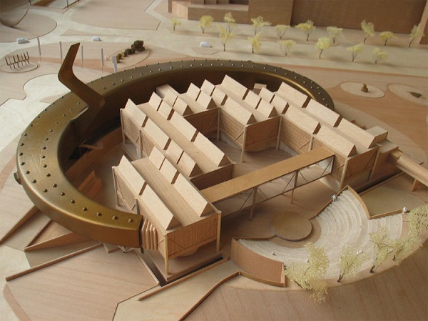 Il Centro per l’Arte Contemporanea Luigi Pecci è la prima istituzione italiana costruita ex novo per presentare, collezionare, documentare e promuovere le ricerche artistiche più avanzate. Dalla sua apertura nel 1988, il Centro per l’Arte Contemporanea Luigi Pecci di Prato ha prodotto una vasta attività espositiva e di documentazione sull’arte contemporanea, numerosi programmi didattici, spettacoli ed eventi multimediali. Ha raccolto in collezione oltre mille opere che mappano le tendenze artistiche dagli anni Sessanta ad oggi: pittura, scultura, cinema e video, installazioni, opere su carta, libri d’artista, fotografie, grafica, e progetti commissionati. Il 16 Ottobre 2016, il Centro Pecci ha riaperto dopo l’inaugurazione del completamento dell’ampliamento a firma dell’architetto Maurice Nio e la ristrutturazione dell’edificio originario progettato dall’architetto razionalista Italo Gamberini. Oggi il complesso ospita, oltre a circa 4000 mq di sale espositive, l’archivio e biblioteca specializzata CID/Arti Visive, che conta un patrimonio di circa 60.000 volumi, l’auditorium–cinema, il bookshop, il ristorante e il bistrot e il teatro all’aperto. Il Centro per l’Arte Contemporanea Luigi Pecci si compone oggi di due parti: l’edificio progettato negli anni Ottanta dall’architetto Italo Gamberini e l’ampliamento firmato dallo studio Maurice Nio/NIO architecten di Rotterdam. Il progetto di Italo Gamberini Centro Pecci di Gamberini L’edificio di Gamberini si sviluppa sopra ad un livello interrato, che ospita gli spazi tecnici del museo, su due piani che alternano forme asimmetriche e simmetriche, volumetrie organiche e razionali, seguendo una pianta ad andamento a U segmentata, chiusa dalla cavea semicircolare del teatro all’aperto e circondata da un giardino. Al piano terra dal 2003 sono stati ricavati spazi dedicati ai progetti d’artista e interventi specifici temporanei, accanto ai laboratori didattici, al bar-ristorante e all’auditorium collocati in questa zona dall’inaugurazione. Al primo piano si trovano l’accoglienza e le sale museali a pianta quadrata, sottoposte nel 2003 ad un radicale intervento di restyling architettonico. L’ingresso al piano nobile, introdotto esternamente da un ponte scoperto rialzato su un lato del giardino, è collegato internamente per mezzo di un tunnel coperto dall’edificio laterale che ospita piccole sale espositive dedicate a mostre di carattere specialistico e documentario, la biblioteca del CID/Centro di Informazione e Documentazione sulle Arti visive e gli uffici del Centro. Ulteriori spazi espositivi sono stati ricavati nel locale posto sotto alla gradinata del teatro. Il progetto di Maurice Nio Ampliamento di Nio Dopo 9 anni di lavori, cominciati nel 2007, sostenuti dal Comune di Prato e dalla Regione Toscana con fondi europei, il nuovo Centro Pecci vedrà un ampliamento di 12.125 mq. La presentazione è avvenuta a Milano, presso il Museo del ‘900. Il progetto architettonico di Maurice Nio, Sensing the Waves, parte da una analisi del progetto di Italo Gamberini e delle problematiche evidenziate nella fruizione dell’edificio. In fase di progettazione l’architetto ha individuato due ordini di problemi: la mancanza di una continuità tra i percorsi di visita e circolazione – il percorso dell’edificio preesistente è lineare, fortemente direzionato, e impone al visitatore di ripercorrere una medesima direttrice al termine della fruizione della mostra – e la scarsa visibilità dell’ingresso principale. Plastico del Centro Pecci esistente con il nuovo ampliamento La nuova costruzione abbraccia la struttura di Gamberini e ne raddoppia la superficie espositiva. Il progetto d’ampliamento è stato pensato per potenziare e intensificare la programmazione e l’offerta culturale e risponde ai requisiti fondamentali di raddoppiare lo spazio espositivo a disposizione, di permettere un’ampia presentazione del patrimonio permanente del Centro Pecci, la suddivisione degli spazi e l’alternanza dei progetti. Scalinata interna L’ampiezza del nuovo piano espositivo, di altezza variabile e suddiviso in due ali che si restringono e si collegano alle attuali sale museali, può inoltre garantire varie soluzioni e modulazioni spaziali adatte alle caratteristiche delle opere d’arte contemporanea. L’avveniristica architettura disegnata da Nio cinge la “fabbrica di cultura” di Gamberini e sintetizza al meglio la nuova centralità che l’istituzione intende assumere in un contesto urbano in trasformazione, dichiarando la sua propensione ad aprirsi e irradiarsi all’esterno. Parte centrale centro Pecci Per affrontare tali questioni l’architetto olandese è partito dal suggestivo parallelo tra il museo e il palazzo imperiale di Tokyo, che pur essendo visibile a tutti ed estremamente riconoscibile, risulta tuttavia inaccessibile. Il primo problema è stato risolto con la creazione, al primo piano – ove si articolano attualmente tutte le sale espositive – di un nuovo percorso, in maniera da creare una diversificazione degli assi di fruizione. Il secondo punto si è risolto collocando al piano terra tutte le funzioni rivolte al pubblico, come il desk di accoglienza, il centro di informazioni, la biglietteria ed il bookshop. Infine, l’ingresso principale è stato orientato chiaramente in direzione dell’incrocio delle strade principali. La galleria dell’ampliamento La nuova estensione del Centro si presenta, in relazione al carattere dell’edificio esistente, da un lato come un intervento rigido e meccanicistico, ispirato ai laboratori tessili di Prato, dall’altro come ‘elastico’ e sognante. La nuova estensione circonda l’edificio esistente intersecandolo solo ove necessario lungo il circuito espositivo. Poiché l’angolazione del piano espositivo varia in continuazione, si originano all’interno dell’edificio spazi dalle atmosfere differenziate, dunque atte ad accogliere diverse 