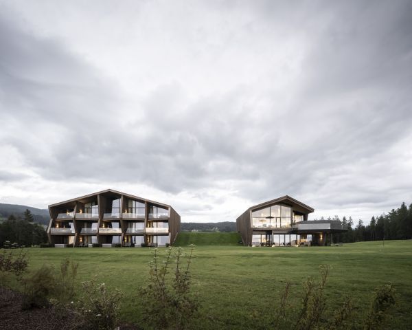 Un’architettura che richiama la tradizione della capanna e al contempo apre la mente ad una visione diversa dell’edificio in alta quota: è l’hotel Aeon di noa* network of architecture: due strutture in legno di larice dalle finestre trapezoidali attraversate dalla natura. La struttura non solo si integra perfettamente nel contesto naturale, ma collega mirabilmente passato e presente come un elegante passaggio, una capsula dove convivono in armonia le due tonalità del cielo e della terra a cura di Claudia Capperucci ©Andrea Dal Negro Indice degli argomenti: Un progetto originale immerso nella natura Il contrasto cromatico blu-beige A un primo sguardo le due strutture in legno che compongono l’Aeon ricordano un alveare, con le sue piccole celle regolari e perfettamente assemblate, ma gli architetti di questo hotel di benessere immerso nella natura rigogliosa e monumentale dell’Alto Adige hanno tratto ispirazione da molteplici elementi del presente, del passato e del futuro, come sono soliti fare nei loro lavori. La struttura dell’hotel Aeon ricorda un alveare – ©AlexFilz Il progetto è firmato noa* network of architecture e si sviluppa su un antico insediamento rurale, il Lobishof, dove si trovano alcune strutture storiche, una locanda e una residenza con stalla. La sfida più grande degli architetti è stata quella di inventare un’architettura originale in grado di convivere con il passato, ma accogliente e con gli standard di una struttura ricettiva di lusso, dove rigenerarsi e ristabilire il proprio equilibrio con la natura. Le due strutture sono collegate da un corridoio interno ©AlexFilz Come spiega l’architetto Christian Rottensteiner: “Creare una dialettica ambivalente fra la tradizione secolare del blocco rurale e un’espressione assolutamente moderna è stato il filo conduttore del processo di progettazione”. Un progetto originale immerso nella natura Ecco allora il colpo di genio: due moduli separati e indipendenti, l’uno per l’area pubblica (reception, centro benessere, bistro, bar), l’altra con le 15 suite; in mezzo ad essi il paesaggio, la terra e il cielo, che grazie all’articolazione di legno e vetro che scandisce i moduli trapezoidali delle finestre, riesce a penetrare all’interno. ©AlexFilz I due moduli sono però collegati da un corridoio interno celato da una dolce collinetta. La forma degli edifici guarda indietro e rende omaggio alle architetture della tradizione locale, con il tetto a capanna e i contraffissi del fienile. L’hotel Aeon in Trentino è realizzato con legno di larice©AlexFilz Il legno di larice proviene dai 50 ettari di bosco della famiglia Ramoser il cui stemma, risalente al 1464 decora il portone d’ingresso dell’edifcio. Il contrasto cromatico blu-beige Ma all’interno l’esperienza del passato svanisce, traducendo gli ospiti in una sorta di mondo di mezzo, una sospensione tra passato e interpretazione del futuro che si palesa nel contrasto cromatico blu/beige presente in tutti gli ambienti (nelle pitture come nei tessuti) e all’altezza degli occhi, 1,60 metri. ©AlexFilz Il blu rappresenta l’acqua, che si trova al primo piano nell’area benessere e nella scenografica piscina esterna semicoperta con bordo a sfioro e vista mozzafiato che emerge dal lato sud-ovest dell’edificio. ©AlexFilz Il beige invece evoca l’elemento della terra, altro protagonista del paesaggio che corre dallo Sciliar al Corno del Renon fino alle Alpi di Merano e alle Dolomiti. Ed è anche il colore che richiama tutto ciò che è organico, naturale. ©AlexFilz Nelle camere il letto è collocato nel punto della stanza da cui si gode della vista più ampia e nelle suite grandi (55 mq), con lato esterno e soggiorno supplementare, il letto matrimoniale è sospeso; la vista qui è su entrambi i lati (due diversi panorami di montagna). Consiglia questo progetto ai tuoi amici Commenta questo progetto