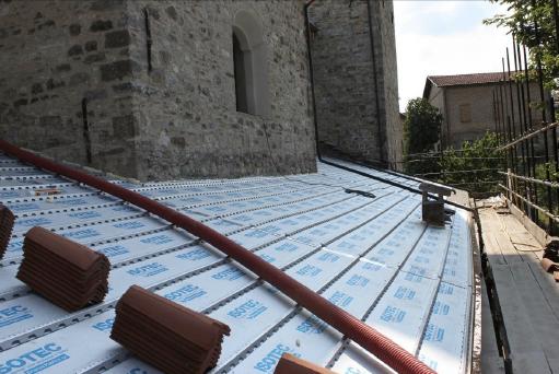 Le prime notizie del borgo di Mattaleto, nei dintorni di Langhirano nel parmense, risalgono al 927. La chiesa sembra sia stata fondata, inizialmente come cappella, addirittura nel periodo longobardo, al quale risalirebbe la devozione antichissima a San Michele Arcangelo. Se ne hanno notizie costanti fino al XVIII secolo, quando ne venne ordinata la ricostruzione nelle forme in cui la vediamo oggi. Ancora, sul finire del XIX secolo, la chiesa viene sottoposta a un rinnovo generale, che vede coinvolti gli spazi interni, le decorazioni delle superfici e la facciata. Si tratta di una chiesa molto importante per la comunità locale (è stata parrocchia del territorio fino al 1946) per la quale è stato un disagio vederla chiusa per tre anni a seguito dei danni strutturali causati dal terremoto del 23 dicembre 2008. Il progetto di restauro e consolidamento Proprio a seguito del terremoto la chiesa è stata seriamente danneggiata e resa inagibile. Grazie a un finanziamento regionale, è stato possibile procedere con i lavori di restauro, consolidamento e miglioramento antisismico che hanno permesso la riapertura della chiesa di San Michele Arcangelo e la sua restituzione alla comunità locale. I lavori hanno previsto il consolidamento dell’estradosso delle volte, delle lesioni verticali e della guglia del campanile, il restauro del cornicione interno della chiesa, delle superfici dipinte, delle cornici in stucco e dei capitelli, ma soprattutto il miglioramento antisismico consistente nella apposizione di tiranti metallici posti sia a livello del sottotetto che al di sopra del cornicione interno della chiesa e collocate lungo le pareti longitudinali. Il recupero della copertura I lavori sono proseguiti con il restauro e il miglioramento antisismico delle coperture, la cui struttura presentava notevoli lesioni dovute all’azione del tempo e del terremoto. I progettisti hanno optato per un tetto ventilato per ridurre al minimo le spese di manutenzione future e hanno scelto il pannello ISOTEC di Brianza Plastica che con il suo correntino in acciaio, che garantisce anche la resistenza statica del pannello, funziona come supporto per la posa del manto di copertura ed evita gli scivolamenti causati da un eventuale sisma. Inoltre, il sistema Isotec è estremamente semplice e veloce da posare, richiede normali utensili da cantiere e non necessita di manodopera specializzata. Come prima cosa si è proceduto allo smontaggio del manto doppio in coppi. Quelli recuperabili sono stati opportunamente puliti. Sono poi state sostituite o integrate, dove necessario, le travi di banchina (dormienti in legno) con elementi in legno di rovere che sono stati fissati sulla testata dei muri con fissaggi chimici. Anche alcune terzere, travi di displuvio e di colmo sono state sostituite sempre con elementi in legno di rovere che ha buone caratteristiche di durezza e di resistenza alle intemperie. Ovviamente tutti i legnami di nuova fornitura come quelli esistenti sono stati trattati con prodotto antitarlo. Le parti in legno che costituiscono la struttura primaria sono state collegate tra loro con profili metallici, mentre quelle che costituiscono l’orditura secondaria sono state collegate con tasselli secondo le indicazioni del progetto esecutivo di miglioramento antisismico. Le testate delle terzere e della trave di colmo, in corrispondenza della prima campata di volta della navata centrale e dell’abside, sono state collegate alle pareti trasversali della chiesa con profili metallici e capo-chiave e/o piastre. Completamente rimessi in opera i travetti e il tavolato sul quale è stata successivamente stesa e fissata la guaina di protezione Elytex-N di Brianza Plastica su cui sono stati montati i pannelli isolanti ISOTEC scelti nello spessore di 60 mm in accordo con quanto richiesto dalla Soprintendenza. Dopo aver montato gronde, converse e pluviali in rame, sono stati ancorati ai listelli di ISOTEC i coppi a canale addentellati preformati e, successivamente, sono stati rimessi in opera i coppi di manto recuperati dallo smontaggio e ancorati tra loro con ganci in rame. Tutte le testate dei muri e le cornici del sottogronda sono state restaurate conservando gli intonaci esistenti e in parte integrandoli. ______________________________________________________________________________________ FOCUS PRODOTTO ISOTEC è un sistema di isolamento termico in poliuretano espanso rigido per coperture a falde, progettato per essere applicato sia nel campo del recupero di tetti d’epoca sia nelle nuove costruzioni. Il pannello è conformato a battenti e incastri contrapposti che lo rendono facilmente manovrabile, facilitandone e velocizzandone la posa in quota. I pannelli Isotec, in sequenza di posa, realizzano infatti rapidamente un impalcato portante, termoisolante, impermeabile alle infiltrazioni accidentali del manto di copertura e, grazie al correntino in acciaio zincato di cui è dotato, microventilato. Questo sistema richiede il rispetto di semplici regole di installazione e il rigoroso utilizzo degli accessori di completamento alla posa, in dotazione. Posato correttamente, ISOTEC permette di realizzare tetti energeticamente efficienti, una risorsa per il comfort abitativo ed il risparmio energetico. Certificazione LEED ISOTEC fa parte dei prodotti di Brianza Plastica che sono stati mappati e classificati secondo i criteri LEED® (Leadership in Energy and Environmental Design). Con questo nuovo posizionamento dei propri prodotti, Brianza Plastica offre un’ulteriore guida ad una scelta consapevole delle soluzioni costruttive, in accordo con i criteri di certificazione internazionali. Il nuovo catalogo Isotec in versione sfogliabile è online su www.brianzaplastica.it nella home page del sito. Disponibile anche il video con le istruzioni di posa su YouTube nel canale di Brianza Plastica. ISOTEC: I VANTAGGI • Isolamento termico. La sua anima interna è in poliuretano espanso, attualmente tra i migliori isolanti termici e