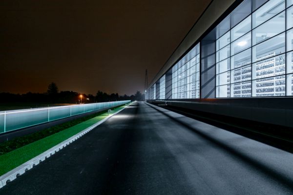 Il nuovo fabbricato di Florim Ceramiche a Fiorano Modenese è caratterizzato da geometrie regolari ed è curato nel dettaglio con finiture di qualità. Il progetto è stato realizzato dalla società Ingegneri Riuniti di Modena che ha gestito l’ampliamento dell’intero edificio. a cura di Silvia Giacometti Far coesistere in modo armonico e funzionale all’interno di un unico edificio la linea produttiva dell’azienda con quella che invece vuole essere la parte più estetica e progettuale, con l’obiettivo di farla diventare un vero e proprio riferimento architettonico per il territorio circostante ma non solo. Con queste premesse la società Ingegneri Riuniti Spa di Modena incaricata per la riqualificazione del progetto della nuova sede di Florim Ceramiche Spa a Fiorano Modenese ha trasformato in realtà la richiesta della committenza ottenendo un fabbricato dalle geometrie regolari e lineari, che, pur appartenendo agli edifici costruiti con tecnologia prefabbricata, si caratterizza per la cura dei dettagli e per le finiture di qualità, riuscendo a distinguersi in modo innovativo dai consueti edifici industriali. Il nuovo edificio Il progetto di ampliamento ha previsto la realizzazione di un nuovo edificio destinato alla lavorazione e allo stoccaggio di lastre di ceramica prodotte in altro sito. La richiesta della committenza La Committenza ha richiesto il progetto di un edificio di circa 50.000 mq destinato in parte a stoccaggio di lastre ceramiche di grande formato e in parte occupato da linee per la lavorazione delle stesse. Lo stesso doveva diventare non solo un luogo della “produzione”, ma anche un riferimento di qualità architettonica per il territorio, favorendone la rigenerazione urbana e ambientale. Il fabbricato Il fabbricato è stato impostato rispetto “al piano campagna” in posizione leggermente sopraelevata al fine di agevolare il raccordo fra l’area di intervento e il piazzale esistente destinato allo stoccaggio pallet. Questa quota è stata raggiunta movimentando il terreno presente nell’area che porterà il fronte strada Pedemontana a circa + 3 e a -2 ml il fronte Sud rispetto al piazzale. Il nuovo fabbricato e l’area stoccaggio saranno raccordate con una rampa carrabile. Il fabbricato, esternamente, si presenta come un volume unitario e regolare, caratterizzato da bucature rettangolari marcate da un cambio di colore sulle parti piene al fine di spezzare percettivamente il volume, oltre che da portoni ad apertura veloce di 5x5ml. La facciata sulla strada Pedemontana – elemento caratterizzante e connotativo dell’intero edificio e dell’ambiente circostante – è caratterizzata da un elemento a sporgere che incornicia le ampie aperture vere e proprie facciate continue, realizzato con una struttura metallica rivestita in pannelli in alluminio tipo alucobond di colore antracite in contrasto cromatico con il bianco caldo dei tamponamenti. Questo elemento, ritmato secondo la struttura retrostante, arricchisce il fronte che vuole essere percepito come quello un edificio di tipo direzionale e non come un fabbricato destinato alla produzione. I “vuoti” presenti sulla facciata permettono non solo la vista delle sofisticate tecnologie robotizzate utilizzate dall’azienda per le proprie attività e di una imponente passerella interna, ma anche il consistente apporto di luce naturale all’interno del fabbricato, generando situazioni di benessere indoor per gli operatori. Il progetto è stato redatto secondo il protocollo BIM che ha permesso di verificare e anticipare in tutte le fasi della progettazione le interferenze fra gli elementi costituenti il fabbricato, oltre ad agevolare le future manutenzioni. L’illuminazione Un forte coordinamento e cura dei dettagli di tutte le finiture interne ed esterne, quali ad esempio le recinzioni, l’illuminazione esterna, le pavimentazioni e le aree verdi completano il progetto che si distingue rispetto ai consueti edifici industriali. In facciata sono state collocate aperture rettangolari a “nastri” verticali, apribili elettricamente a vasistas verso l’interno e distribuite in modo favorire l’illuminazione naturale il più uniformemente possibile. Spicca in questo “sistema” la facciata rivolta Nord sulla Pedemontana caratterizzata da una sequenza dalle ampie vetrate apribili. Anche la copertura contribuisce all’illuminazione naturale del fabbricato essendo dotata di shed con vasistas apribili elettricamente vero l’esterno. L’insieme di queste aperture assolve complessivamente pianamente il rapporto di 1/8 di illuminazione naturale sia per il capannone che per i locali di servizio e uffici. I colori I colori previsti per le facciate sono stati coordinati con quelli già utilizzati nei fabbricati esistenti al fine di integrare la nuova struttura gli altri edifici. Si è prevista una tinta tortora chiaro per le parti piene, mentre per gli infissi, lo sporto e i tinteggi corrispondenti ai pannelli con le bucature il grigio antracite, colore già anch’esso ampiamente utilizzato negli infissi degli edifici esistenti. “Percorso Amoroso” di Giuseppe Gallo La destinazione d’uso La nuova fabbrica 4.0, esempio di avanguardia tecnologica, si estende su una superficie di 48 mila metri quadrati (a fianco della sede istituzionale) ed è dedicata alla lavorazione e alla logistica delle grandi lastre. Un sofisticato software ha il compito di controllare e gestire in modo automatizzato gli impianti, i robot antropomorfi e i veicoli LGV (Laser Guided Vehicle) di questo stabilimento e di quello realizzato nel 2017 a Mordano (BO), per una completa tracciabilità dell’ordine. Questo sistema di comunicazione si pone l’obiettivo di innalzare la qualità del servizio al cliente e ridurre le tempistiche di consegna dei materiali. Costruita con la consueta sensibilità alla bellezza e al design, la struttura può contare su 26.000 mq di pannelli fotovoltaici che, insieme agli impianti già in essere, portera