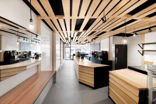 Interior design e ristrutturazione più nuovo ampliamento E’ stato lo studio di architettura Nature Humaine, con sede a Montreal, ad essere stato incaricato di rendere più contemporaneo il nuovo look della catena di panetterie “Au Pain Doré”. Questo negozio, totalmente ristrutturato, si trova al pian terreno di un edificio su tre livelli nel quartiere di Côte-des-Neiges a Montreal. Il design di “Au pain doré” si fonda sul concetto europeo di un “bar pasticceria” che combina la vendita di prodotti da forno freschi con un caffè di alta qualità, e dove la figura del barista è al centro della scena. Gli interni sono stati totalmente ridisegnati con un ampliamento sul retro per una superficie totale calpestabile pari a 140 m2. Per rendere più dinamica una configurazione spaziale piuttosto stretta e lineare, gli architetti hanno pensato a una struttura in legno realizzata interamente con tavole di tulipier americano (American tulipwood). “Il concetto spaziale del progetto è ispirato dalla struttura reticolare dei cestini in vimini per il pane,” spiega Stéphane Rasselet, l’architetto incaricato del progetto, “che, nella sua ritmica casualità, permette un’esperienza dinamica sin dall’ingresso in negozio.” Una cornice strutturale in legno con elementi verticali che si susseguono a intervalli regolari regge una serie di assi in tulipier disposte in maniera casuale sul soffitto per creare un pergolato che si apre e si chiude a creare spazi per l’illuminazione e la ventilazione. I toni bianco crema che caratterizzano il tulipier risaltano sulle superfici nere del soffitto sovrastante, mentre il reticolo, scendendo lungo la parete, si sviluppa in scaffali per l’esposizione di pane e pasticcini e in panche e tavoli per la consumazione. “Per questo progetto cercavamo un tipo di legno con una venatura interessante e colori e tonalità diverse. Gli elementi in legno dovevano risaltare sugli altri materiali monocromatici usati nel progetto (acciaio dipinto di nero, piastrelle bianche, pavimento grigio), pur fondendosi armonicamente nello stile che caratterizza il design contemporaneo”. Il tulipier è usato anche per creare gli scaffali, i piani dei tavoli e il rivestimento del lungo bancone di servizio che corre per tutta lunghezza di una parete nello spazio centrale, mentre gli elementi in vetro integrati nel bancone e la scaffalatura dietro l’area di preparazione dei cibi sono studiati per esporre i prodotti da forno. Le assi di tulipier che rivestono i lati del bancone di servizio sono state montate ad angolo, quasi come il rivestimento esterno di una costruzione in legno, così da creare linee di ombra che enfatizzano le prospettive dinamiche. L’area del barista (area 3*) si trova davanti ai posti a sedere del bar posizionati lungo la vetrina in vetro che si affaccia sulla strada. Inoltre, il bancone di vendita (area 4*) ha un angolo diagonale per sottolineare l’ingresso nell’area del panificio e permettere di avere altri posti a sedere contro la parete opposta. La pannellatura in tulipier si innalza successivamente per nascondere alla vista la cucina adiacente (area 5*), mentre i bagni sono nascosti all’interno di una volumetria nera a sbalzo che si allunga fino al soffitto per spezzare il pergolato in legno, dividendo l’area di vendita da una parte e lo spazio di consumazione dall’altro. I tavoli e le panche ammobiliano la metà posteriore della panetteria, che guarda su una piccola terrazza attraverso finestre a tutta altezza. Faretti e lampadine a vista pendono dal soffitto per illuminare il negozio, sospesi sopra le superfici di lavoro e le aree di consumazione. I piani in tulipier bianco crema dei tavoli e delle panche contrastano con le strutture di supporto realizzate in acciaio nero anche grazie alla finitura del legno in uretano con 35% di vernice lucida che l’architetto ha scelto per conferire un effetto finale trasparente che, spiega, mantiene l’aspetto naturale, il colore e la venatura del legno migliorandone la durabilità per soddisfare i requisiti di una panetteria sia in termini di uso che di manutenzione. “Abbiamo già usato il tulipier in altri progetti, ma mai nella sua finitura naturale” commenta l’architetto Stéphane Rasselet. “Lo abbiamo usato, per esempio, per alcuni mobili, ma non piallato e trattato con mordente per conferirgli un aspetto caldo e rustico. Per questo specifico progetto di panetteria ci è piaciuto il gioco naturale delle sue sfumature. È un legno che vorremmo usare ancora in progetti futuri.” * Cfr. pianta del piano Tulipier americano (Liriodendron tulipifera) Il legno di tulipier americano ha un alburno bianco crema che talvolta è striato. Il durame varia dal marroncino giallognolo al verde oliva. Con l’esposizione alla luce, il colore verde tende a scurire, diventando marrone. La fibra è diritta, da media a fine. Il tulipier è una delle specie di latifoglie americane più economiche e versatili, ed è utilizzato nel settore dell’edilizia, dell’arredamento e delle rifiniture per interni. Sebbene sia relativamente leggero e tenero, il tulipier americano offre eccellenti proprietà meccaniche e un elevato rapporto resistenza/peso, che lo rende ideale per la realizzazione di travi e strutture laminate. Il tulipier è spesso verniciato o trattato con mordenti, sebbene sia in aumento l’uso della sua finitura naturale, con interessanti variazioni di colore e venature. Consiglia questo progetto ai tuoi amici Commenta questo progetto