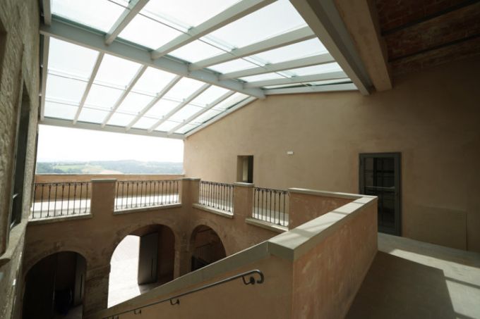 Con l’intervento di riqualificazione, Palazzo senza Tempo conquista nuovi spazi per mostre, allestimenti e laboratori residenziali. Continua così il percorso di comunità resiliente del borgo toscano che punta su cultura e ambiente a cura di Pietro Mezzi I nuovi spazi di Palazzo senza Tempo a Peccioli (credits, Andrea Testi, courtesy comune di Peccioli) Indice degli argomenti: La riqualificazione del Palazzo senza Tempo Un centro studi sulla resilienza Le scelte architettoniche Un’architettura ponte tra passato e futuro Il museo diffuso di Peccioli La Carta di Peccioli e la 17^ Biennale Architettura “Un trampolino tra passato, presente e futuro”. Mario Cucinella definisce così la spettacolare promenade sospesa nel vuoto del Palazzo senza Tempo di Peccioli, piccolo comune pisano a sud di Pontedera. Nel centro storico del borgo medievale, noto per aver adottato un’agenda di sviluppo che lo ha reso un laboratorio di resilienza artistica, sociale, tecnologica e progettuale a cielo aperto, è stata inaugurata l’opera di Cucinella: un intervento di riqualificazione e rigenerazione di un bene storico. La riqualificazione del Palazzo senza Tempo L’intervento, parte di un programma di valorizzazione e restituzione alla comunità del patrimonio storico di Peccioli, si è concretizzato, lungo il limite del bastione medievale, nel recupero e nella riqualificazione del quattrocentesco Palazzo su via Carraia e nella trasformazione del sottostante edificio diroccato. Obiettivo del progetto, sviluppato tra il 2016 e il 2018 su un’area di 2.500 metri quadrati, è consistito nel creare nuovi spazi polivalenti di incontro, servizi, eventi culturali aperti alla comunità. La grande promenade e i nuovi spazi culturali sottostanti credits, Andrea Testi, courtesy comune di Peccioli La ristrutturazione del Palazzo su via Carraia, ribattezzato Palazzo senza Tempo perché capace di legare insieme passato, presente e futuro che ne ha riconfigurati spazi e funzioni dei piani, è culminata negli interventi in copertura e in facciata, con la creazione di nuovi punti di vista degli interni verso l’esterno, grazie all’inserimento di lucernai e bowindow che accolgono la luce naturale. La nuova copertura vetrata, posta sul passaggio della corte storica, completa la permeabilità visiva degli ambienti. Un centro studi sulla resilienza Il palazzo storico, già di proprietà della famiglia de’ Medici, è stato acquistato anni fa dal Comune dall’ultimo proprietario, la Fondazione Gaslini, che nel recente passato ha dato lavoro fino a mille persone. Un bene che, nel tempo, è finito nel degrado. Il palazzo sarà ora sede di mostre, allestimenti, laboratori residenziali con università nazionali e internazionali per studi legati al percorso di Peccioli come esempio di comunità resiliente. Nascerà anche un centro studi sulla resilienza dei piccoli borghi italiani. La ristrutturazione ha puntato sull’inserimento di lucernai e bowindow credits, Andrea Testi, courtesy comune di Peccioli Il Palazzo senza Tempo è in grado oggi di ospitare mostre temporanee e permanenti. La prima opera, firmata dall’artista danese Jeppe Hein, è giunta direttamente dalla König Galerie di Berlino: sospesa nel vuoto, rifrange i raggi provenienti dal lucernario soprastante creando un gioco di riflessi esterni e sulla sua stessa superficie. Le scelte architettoniche Il piano strada è stato collegato al nuovo volume architettonico, nato dall’edificio diroccato sottostante, con un vano scala. La costruzione, incastonata ai livelli -1 e -2, è ora un elemento architettonico dominato da un gioco di trasparenze che si affaccia sul contesto panoramico della Valdera. Render della promenade a sbalzo sulla Valdera credits, MC A L’opera di riqualificazione si presenta come un ponte tra la memoria storica che ha caratterizzato questi palazzi e il suo futuro, un centro civico e culturale per il paese, per l’intera Valdera e le migliaia di turisti in visita ogni anno in questo museo a cielo aperto. Un’architettura ponte tra passato e futuro “L’intervento, condotto con coraggio e gentilezza – commenta Cucinella – fa diventare i palazzi parte della vita contemporanea del territorio: la rigenerazione di un sito deve intendersi come un processo capace di interpretare il passato in dialogo con la contemporaneità. Questa architettura, ponte tra passato e futuro, vuole essere solo una cornice di questo bellissimo paesaggio, che sembra un quadro del 1500”. La promenade a sbalzo misura 600 metri quadrati credits, Andrea Testi, courtesy comune di Peccioli Tra i due edifici riqualificati, una maestosa terrazza sospesa di 600 metri quadrati e con uno sbalzo da terra di circa 20 metri, domina il paesaggio ritmato dai poggi pecciolesi. In dialogo con gli accessi pubblici preesistenti e una scalinata laterale che dal piano strada porta al livello -2, la terrazza, come un grande pontile, è affacciata sulla vallata e diviene una nuova piazza pubblica, impreziosita dal murale curato dal pittore e scultore francese Daniel Buren, che testimonia il connubio tra arte e architettura contemporanea, marchio di fabbrica del borgo pecciolese, noto a livello internazionale per le sue bellezze artistiche e architettoniche. Il museo diffuso di Peccioli L’idea del museo diffuso nasce con il progetto comunale Cantiere Peccioli, che si è fatto promotore di una serie di iniziative nel segno dell’arte e della cultura contemporanea. Da quasi trent’anni, infatti, artisti di fama internazionale creano opere ad hoc pensate per la cittadina e il territorio e destinate a restare nel tempo. Lo sbalzo della promenade visto da sotto e il paesaggio della Valdera credits, Andrea Testi, courtesy comune di Peccioli Dagli enormi Gabbiani di Piazza del Popolo alle installazioni luminose di Vittorio Corsini che appaiono tra vicoli e facciate delle case, fino allo Sguardo di Peccioli, sempre dello stesso artista, dove gli occhi degli abitanti sono stati fot