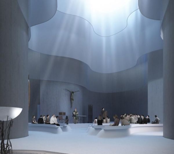La chiesa dedicata a Santa Maria Goretti si configura come elemento unico all’interno del contesto in cui è collocato. La facciata principale, che si apre sulla nuova piazza della chiesa, è caratterizzata da pochi ma essenziali elementi che definiscono i principali segni di riconoscibilità della tradizione cristiana: il portale di ingresso e la croce. La pianta dalla forma organica è disegnata partendo dalle curve di alcune delle più belle chiese barocche, venendo a creare una pianta monumentale e dinamica in cui lo spazio centrale si confronta e si rapporta in maniera differente con le cappelle laterali. Le opere d’arte sono state ideate tenendo conto del progetto architettonico e delle sedi indicate per la loro destinazione. L’intento, è stato quello di far convivere in modo armonico le due discipline senza tradirne l’autonomia. Per queste, ci si è avvalso di materiali legati alla tradizione come, il marmo, il bronzo e il mosaico che si confrontano e dialogano con l’eco del barocco che si percepisce nell’innovativo carattere dell’architettura. Alcune opere saranno più vicine alle forme fluide delle pareti della Cappella, come l’Ambone, la figura della Vergine Maria, la Custodia Eucaristica e il Fonte Battesimale. Gli edifici sono stati progettati secondo i principi della progettazione passiva per attingere alle risorse naturali: essi infatti ‘respirano’ grazie alla ventilazione e sono illuminati naturalmente, limitando il ricorso agli impianti meccanici e promuovendo un rapporto armonioso con il creato. Progetto vincitore del Progetto Pilota CEI 2011 Artista: Giuseppe Maraniello Liturgista: Don Amilcare Zuffi Strutture: Favero & Milan Impianti tecnici: Manens – TIFS Illuminotecnica: Cannata Lightning Design Rendering 3D: ENGRAM Consiglia questo progetto ai tuoi amici Commenta questo progetto