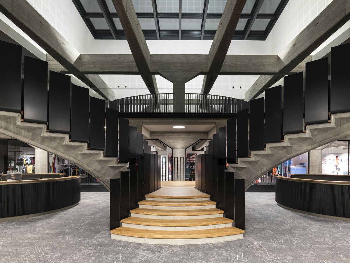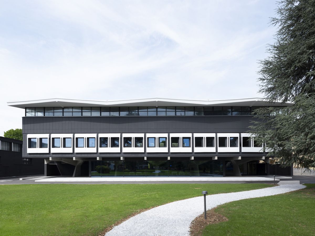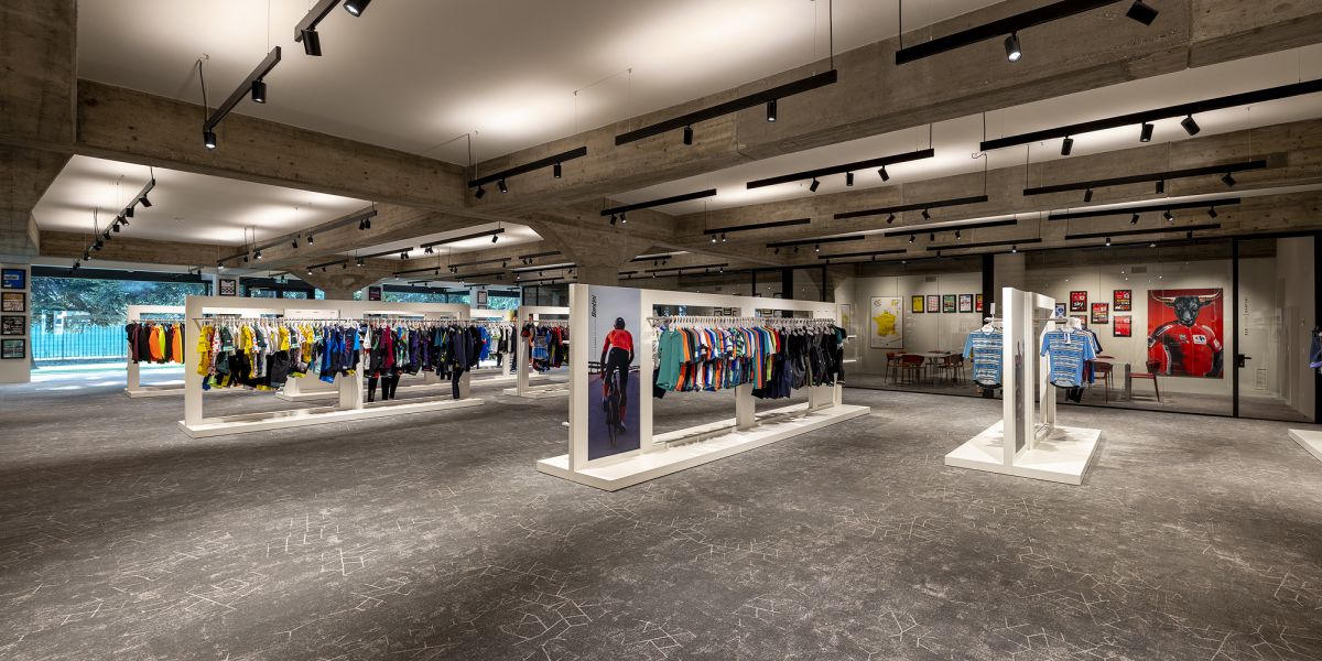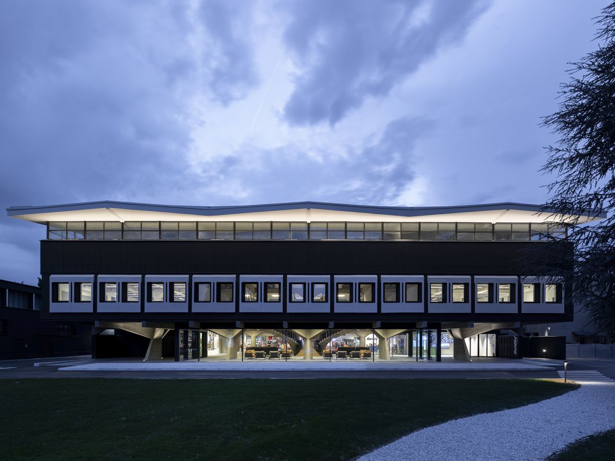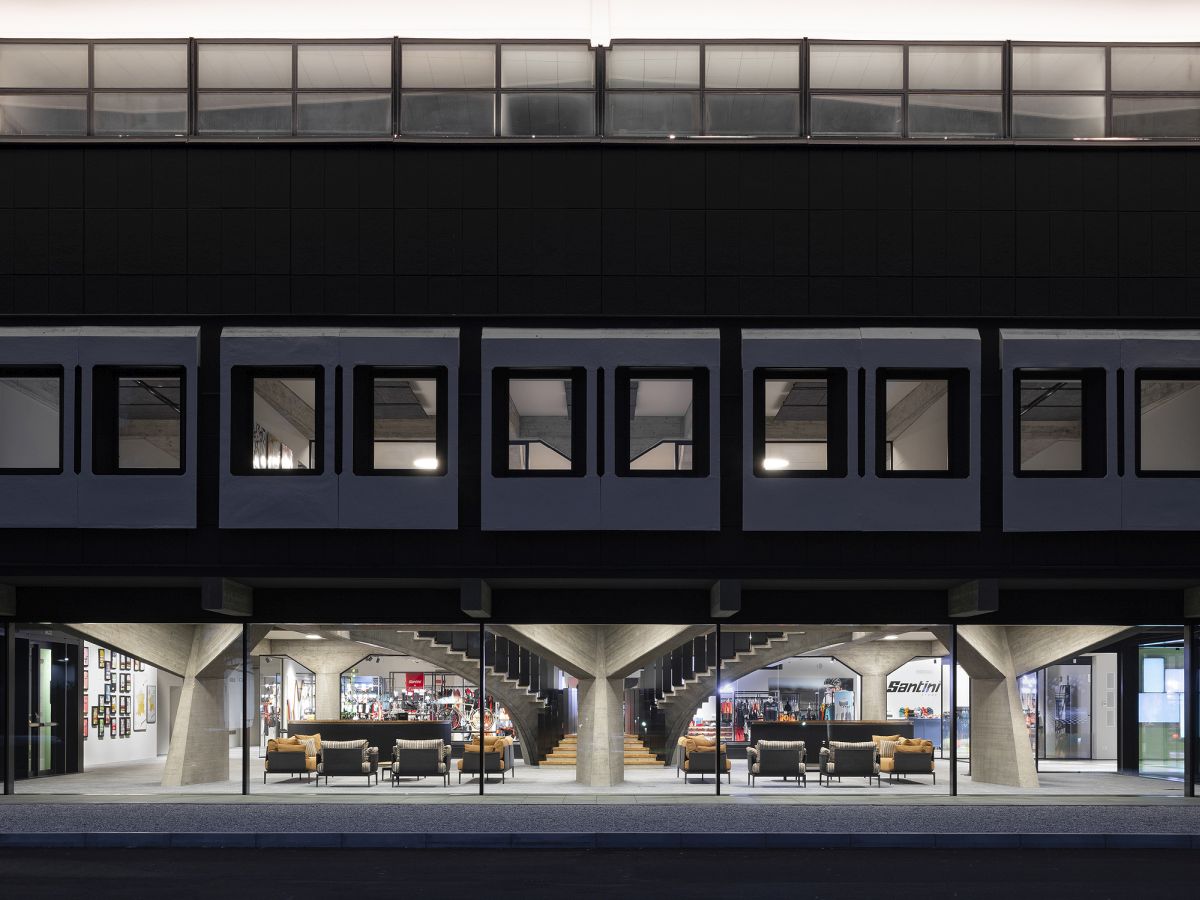 L’intervento progettato dall’architetto Marco Acerbis per la nuova sede dell’azienda di abbigliamento sportivo Santini, fa rivivere la spettacolare architettura in cemento armato di Giuseppe Gambirasio. Un intervento equilibrato che migliora la funzionalità e la luminosità di un edificio di una società leader del settore A cura di: Pietro Mezzi Indice degli argomenti Toggle L’intervento di ristrutturazioneLa struttura dell’edificio In oltre mezzo secolo di storia, Santini, importante azienda tessile di Bergamo specializzata nella produzione di abbigliamento ciclistico sportivo, ha saputo conquistare ampie fette di un mercato in crescita e la presenza nelle principali competizioni sportive di settore, come il Tour de France (per cinque anni, dal 2022, i prodotti dell’azienda orobica vestiranno la maglia gialla della manifestazione francese) e la collaborazione, ormai più che trentennale, con la Federazione ciclistica mondiale. Il trasferimento a Bergamo Un paio di anni fa, la società – presieduta dal fondatore Pietro Santini, e oggi guidata dalle figlie Monica e Paola – decise di trasferirsi dall’attuale stabilimento di Lallio a Bergamo città. Nel 2021, infatti, Santini acquistò una delle aree a destinazione industriale con uffici più ambite della città, collocata in una zona strategica, vicina al centro e facilmente raggiungibile dalle principali vie di comunicazione. Alle fine di quell’anno iniziarono i lavori di ristrutturazione, affidati all’architetto bergamasco Marco Acerbis. L’intervento di ristrutturazione Sull’area, nel 1960, furono costruiti alcuni edifici, tra cui una palazzina uffici progettata dall’architetto Giuseppe Gambirasio, e ricavato un parco con alberi di alto fusto. Alla base dell’intervento di ristrutturazione, l’atteggiamento del progettista è stato rivolto al dialogo con le preesistenze edilizie e architettoniche, ma contemporaneamente a permettere all’azienda di poter sviluppare il suo nuovo potenziale produttivo. La progettazione, fin da subito, si è orientata all’eliminazione di alcuni volumi non più rispondenti alle nuove esigenze aziendali e all’ampliamento della volumetria del piano terra dell’edificio, così da creare spazi adatti al bisogno di rappresentanza della società. L’ingresso alla nuova sede; al centro la scala elicoidale, sulla destra il bar Con la modifica della posizione degli accessi è stato possibile includere, al primo piano, all’interno dell’area destinata agli uffici, lo spazio vendita aperto al pubblico. La zona vendita al piano primo Una scelta che consente agli acquirenti di apprezzare l’architettura in cemento armato progettata negli Anni ’60 e che caratterizza l’edificio sia all’interno che all’esterno. La struttura dell’edificio L’eccezionale struttura di travi e pilastri a sagoma variabile, è stata valorizzata con l’eliminazione di alcune partizioni interne, che nascondevano i capolavori in cemento armato. Per ottenere uno spazio ampio e collegato alla vista esterna, in un edificio profondo e talvolta buio, la vetrata centrale sopra il vano delle due scale è stata demolita. In questo modo, ai piani terra e primo, dove sono posizionati gli uffici, è possibile godere della luce naturale. Al piano terra, per poter usufruire di un pianerottolo più ampio con gradini più larghi e avvolgenti alla base, sono state parzialmente modificate le rampe elicoidali delle scale in cemento armato gettate in opera. Sono stati anche riprogettati i parapetti in metallo ricurvo a elle. La spettacolare scala elicoidale, che dal primo pianerottolo si dirama in due direzioni Al piano terra è collocata la reception, con due banconi, uno dei quali funge da bar. Si tratta di punti focali che trasformano la zona in luogo di aggregazione e rappresentanza. Lo showroom e lo spazio ristorante sono collocati sul lato opposto all’ingresso ed affacciano su un giardino privato aziendale. Al piano primo, disposti in open plan, sono localizzati gli uffici, separati tra loro da quinte composte da doghe sagomate e progettate su misura. La scala, le travi e il tamburo illuminato indirettamente L’illuminazione è garantita da lampade ad incasso, che proiettano una luce diffusa, simile a quella naturale; dove necessario, invece, per esigenze espositive, si è ricorso a binari con proiettori. Dal punto di vista illuminotecnico, il tamburo sopra l’atrio è stato considerato alla stregua di un grandissimo paralume: sopra le travi sono stati infatti posizionati dei proiettori ad alta potenza che illuminano le pareti della vetrata, con una luce indiretta che ricade sugli spazi sottostanti. Per la fono assorbenza al primo piano sono stati realizzati schermi su misura Marco Acerbis Laureato in architettura al Politecnico di Milano, per alcuni anni ha lavorato nello studio Foster+Partners di Londra; al ritorno in Italia, per qualche tempo, ha operato nello studio di Mario Bellini. Successivamente, a Bergamo, ha aperto il proprio studio. Ha ricevuto la menzioni d’oro al XXI Compasso d’Oro. Tra le sue opere, la realizzazione di Polins, il Polo di Innovazione Strategica, un edificio certificato CasaClima Classe A+, finalista al Premio Fondazione Renzo Piano, il progetto dello showroom di Pentole Agnelli. Scheda progetto HQ Santini Località: Bergamo Committente: Santini spa Funzioni: produttiva e terziaria Progetto: Marco Acerbis Superficie dell’area: 24.000 mq Superficie verde: 14.000 mq Totale superfici interne: 14.300 mq Superficie produttiva: 6.000 mq Superficie uffici: 1.000 mq Produzione fotovoltaica: 290 kwh Project management: Avalon General contractor: Intesa Costruzioni Progettazione e DL impianti: DiGiErre3 Anno: 2023 Consiglia questo progetto ai tuoi amici Commenta questo progetto
