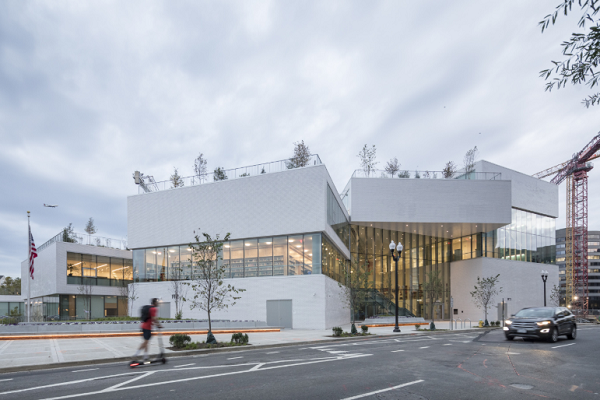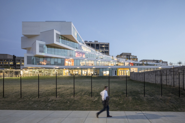 Porta la firma di BIG il progetto della scuola pubblica con due giardini sul tetto denominato The Heights. L’edificio, realizzato in Virginia in collaborazione con l’architetto Leo A Daly, ha ricevuto, anche grazie al sistema di giardini e terrazze panoramiche, il prestigioso riconoscimento LEED Gold.Il progetto nasce con la finalità di unire due sistemi scolastici esistenti ad Arlington: la scuola H-B Woodlawn, che accoglie le classi da 6 a 12 anni, e il programma Shrun Eunice Kennedy, che offre un’istruzione speciale per gli studenti di età compresa tra gli 11 e i 22 anni. The Heights si estende su una superficie di 16.700 metri quadrati e ospita oltre 775 studenti. Attraverso questo progetto BIG rivoluziona la concezione di edificio scolastico, organizzando le funzioni all’interno di una struttura caratterizzata da cinque lastre rettangolari che aprendosi assumono la forma di un ventaglio generando terrazze verdi e prolungando le aule. Caratteristiche del progetto L’edificio, realizzato in mattoni bianchi smaltati e ampie vetrate, presenta nella zona centrale le diverse attività dedicate agli studenti tra cui l’auditorium da 400 posti, la palestra, la biblioteca, la reception e la caffetteria, posizionate accanto a una hall a tripla altezza.I due piani inferiori comprendono una sala di fisioterapia professionale e uno spazio per favorire l’elaborazione sensoriale. L’organizzazione delle aule assume la forma di un ventaglio generando una serie di terrazze a cascata la cui profondità è stata calcolata appositamente per poter ospitare grandi alberi e gestire il deflusso delle acque piovane, riutilizzate per l’irrigazione delle piante stesse. La disposizione dei cinque volumi delle aule, impilati e imperniati su una base di dimensioni maggiori, permette di collegare ogni piano al giardino pensile corrispondente, che risulta sovrastare le aule sottostanti.In contrasto con l’esterno in mattoni bianchi, ogni livello dell’aula all’interno dell’edificio è decorato con un colore unico, tra cui blu, viola, rosa, giallo e arancione. L’accesso ai diversi piani e ai giardini è gestito mediante una scala a chiocciola che si alterna tra interno ed esterno snodandosi attraverso i vari piani per consentire un accesso funzionale a ciascuno di essi. In questo modo tutti gli studenti, di entrambi i programmi e di tutte le età, risultano essere visivamente e fisicamente collegati tra loro, favorendo il contatto sociale. La volontà di collegare i diversi ambienti creando una continuità è ben evidenziata dalla presenza di una grande quantità di vetri sia all’interno che all’esterno. Le terrazze svolgono una funzione importante dal punto di vista sociale in quanto permettono ai ragazzi di riunirsi all’aperto trascorrendo momenti di svago, ma assumono anche una funzione di apprendimento grazie alla presenza di spazi dedicati.Per trascorrere momenti di svago all’aria aperta e svolgere le attività sportive è presente un campo sportivo delimitato da pareti verdi. Lo spazio esterno è poi completato da due cortili sotto quota, un giardino d’ingresso e dal nuovo parco pubblico all’angolo tra Wilson e Quinn Street dal quale è possibile accedere alla prima terrazza sul tetto quando la scuola non è in sessione. Foto by big.dk Consiglia questo progetto ai tuoi amici Commenta questo progetto