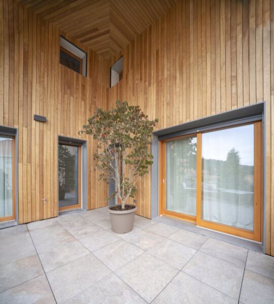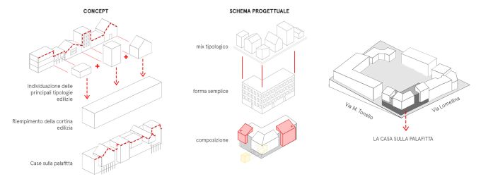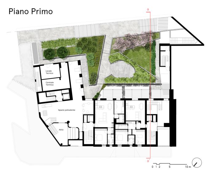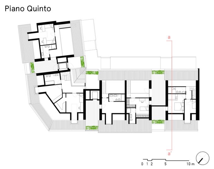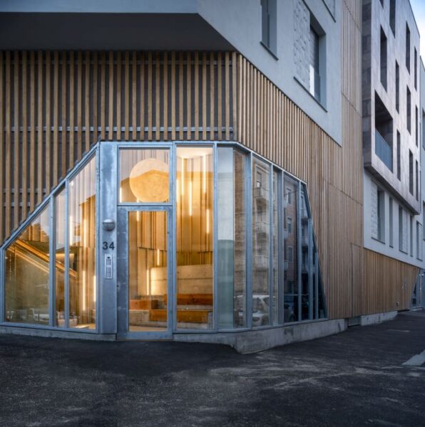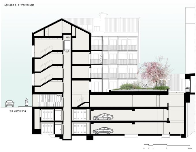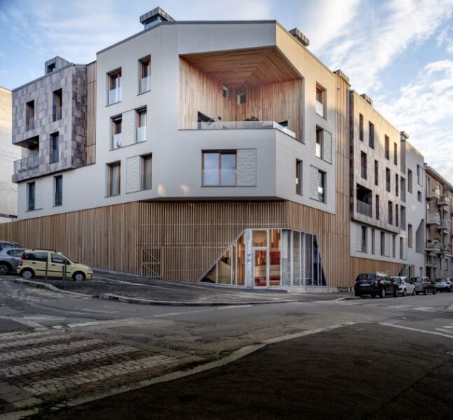 + Studio architetti Filippo Orlando con Mediapolis Engineering firma un nuovo complesso residenziale dal design semplice e luminoso, che con un sapiente gioco di piani sfalsati si adatta alla pendenza della precollina. Un edificio che guarda all’architettura decostruttivista della west-coast a cura di Pietro Mezzi Nel basamento si alternano cemento a vista, acciaio, listelli di legno grezzo e vetro (foto, © Fabio Oggero) Indice degli argomenti: L’edificio ad angolo Le due facciate Abitare e senso di comunità C’è un po’ di San Francisco anche a Torino. Case unifamiliari di due o tre piani allineate lungo le strade che vanno diradandosi verso la collina. Siamo nella zona di Madonna del Pilone, alle spalle del motovelodromo Fausto Coppi, all’incrocio tra via Lomellina e via Tonello. Qui, + Studio architetti Filippo Orlando con Mediapolis Engineering ha appena concluso la trasformazione di un lotto ad angolo, prima adibito a parcheggio, in un nuovo complesso residenziale, dal linguaggio inconsueto per Torino in cui si alternano cemento a vista, acciaio, listelli di legno grezzo e vetro. L’edificio ad angolo Preservando i due piani interrati dell’autorimessa esistente, il progetto ricostruisce il tassello mancante nella cortina edilizia. Articolato in un volume d’angolo di quattro piani fuori terra con il tetto a falde con abbaini, il nuovo edificio, nell’alternarsi dei materiali e dei pieni e vuoti, guarda all’architettura decostruttivista della west-coast. Vista della facciata su via Lomellina foto, © Fabio Oggero Il basamento è una reinterpretazione degli edifici circostanti anni ’50, in cui l’edificato era spesso sollevato da terra da un piano pilotis: gli appartamenti sono dunque “sospesi”, andando ad appoggiarsi e incastonare sulle lamelle di legno dalle quali è costituito il basamento, leggero e trasparente. Il progetto delinea così una casa “su palafitta” dal design semplice e luminoso, che con un sapiente gioco di piani sfalsati si adatta alla pendenza della pre collina. Le due facciate Il lotto ad angolo è caratterizzato da due facciate distinte. Il serramento dell’atrio di ingresso (foto, © Fabio Oggero) La facciata urbana, orientata a nord e a ovest, è ibrida e scandita verticalmente da diversi elementi. I bordi del lotto e il blocco centrale d’angolo richiamano il tessuto urbano pre collinare, caratterizzato da villette unifamiliari. Questi volumi sono rivestiti da intonaco grezzo e giocano con lo sfalsamento delle aperture e l’alternarsi dei pieni e dei vuoti ottenuti per sottrazione, che culminano nella loggia d’angolo su due livelli. La scala dell’atrio di ingresso, con gradini gettati in opera e parapetto in lamiera microforata ottonata (foto, © Fabio Oggero) I volumi sporgenti a bow-window, invece, dialogano con l’elegante architettura residenziale anni cinquanta del contesto, nella scansione dei terrazzi chiusi da ringhiere a bacchette metalliche e nell’uso del gres porcellanato modulato sui toni del rosso viola. L’ingresso sull’angolo è segnato da un taglio netto nel basamento a listelli lignei che si apre su una hall a doppia altezza, un cronotopo scenografico che tramite una serie di oculi introduce agli spazi comuni e al giardino interno. Vista del terrazzo angolare a doppia altezza foto, © Fabio Oggero La facciata verso corte, orientata a sud e a est, è una enfilade di ampi balconi continui a trama regolare in acciaio zincato e solette in cemento. Concepiti come vera e propria estensione dello spazio interno si aprono sul verde della collina e sul nuovo giardino interno costituendo fondità dei balconi. Il cortile ha una vocazione di spazio comune, in cui sono ubicate funzioni ad uso collettivo: un giardino, delle sedute e un’area di gioco dedicata ai bambini. Abitare e senso di comunità Il progetto di via Lomellina rinnova l’immaginario urbano proponendo un nuovo modo di vivere con ampi spazi di vita comune, che ha conquistato un insieme eterogeneo di famiglie in cerca di un nuovo senso di comunità. Pianta del piano primo (credits, + Studio Architetti Filippo Orlando) Pianta del piano quinto (credits, + Studio Architetti Filippo Orlando) Sezione trasversale (credits, + Studio Architetti Filippo Orlando) Gli spazi comuni del complesso (credits, + Studio Architetti Filippo Orlando) Schema compositivo (credits, + Studio Architetti Filippo Orlando) +Studio Architetti Filippo Orlando Dal 2018 Filippo Orlando è il titolare unico di +Studio Architetti, società di professionisti fondata nel 2002. Si occupa di progettazione, di corporate image e di strategie di comunicazione. A metà anni ’90 con Daniele Marzocchi fonda Manodopera Architetti Associati. Nel 2005 vince la gara per la progettazione degli stand Alfa Romeo per i saloni internazionali e gli uffici del brand a Torino, ideando e realizzando dal 2005 al 2010 gli allestimenti dei Motorshow di Parigi, Francoforte, Ginevra, Londra, Tokyo e Bologna. Dal 2008 al 2010 è il titolare della cattedra di Home Design presso lo Iaad di Torino. Nel 2010 è incaricato da FCA della riqualificazione, della progettazione del landscape e degli uffici dell’ex stabilimento Zastava di Kragujevac in Serbia e della propria sede di rappresentanza a Belgrado. Agli stessi anni risale la realizzazione della villa Z a Belgrado, in collaborazione con l’architetto Goran Vojvodic. Nel 2012 progetta e realizza il Communication Center e il relativo progetto di landscape e di inserimento territoriale nel nuovo stabilimento FCA di Goiana in Brasile. Tra il 2015 e il 2020 a Torino progetta alcuni interventi residenziali: Bernini 2, Borgo Hermada, e Via Lomellina. Nel 2021 viene incaricato da Redo Sgr della progettazione del social housing di via Amidani a Milano, che prevede la realizzazione di 230 appartamenti. Consiglia questo progetto ai tuoi amici Commenta questo progetto
