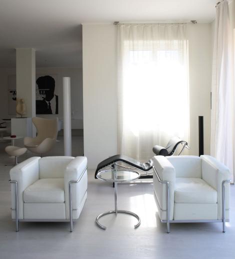 Il committente, un collezionista d’arte, desiderava ambienti minimali e il più possibile bianchi, al fine di poter integrare le opere della sua collezione nell’arredamento. Aveva inoltre bisogno di ricreare i giusti spazi nella zona living per permettere alla sua figlia più piccola di poter giocare liberamente. La casa deriva dall’unione di tre unità immobiliari contigue. Lo sforzo dei progettisti è stato quello di restringere al minimo le zone di disimpegno e di creare grandi spazi aperti, soprattutto in prossimità della terrazza panoramica. L’ingresso apre su un grande soggiorno caratterizzato da diversi spazi, come la zona conversazione, la sala da pranzo e lo spazio relax. Gli ambienti sono inondati dalla luce proveniente da Ovest che penetra all’interno del lussuoso appartamento grazie a cinque grandi finestre. Il minimalismo architettonico è stato appositamente pensato per dialogare con le numerose opere d’arte all’interno della casa; nella zona pranzo il ritratto di John F. Kennedy di Sergio Lombardo sulla parete di fondo è in perfetta armonia con il tavolo e le sedie Tulip di Eero Saarinen prodotti da Knoll. Le pareti sono bianche come anche il parquet, posato a listoni in prefinito spazzolato, sbiancato e finito ad olio. Il total white che caratterizza gli spazi è interrotto da alcuni complementi d’arredo neri come la chaise-longue LC4 nel soggiorno, disegnata da Le Corbusier, Pierre Jeanneret, Charlotte Perriand per Cassina o la Eames Lounge Chair e Ottoman di Charles e Ray Eames per Herman Miller prodotta da Vitra, collocata nell’angolo relax della camera da letto padronale. Altri contrasti sono creati dai mosaici e dai pavimenti dei bagni, realizzati in marmo grigio carnico “a casellario” e dall’ardesia a spacco utilizzata in cucina. La zona notte, situata dalla parte opposta rispetto alla zona living, è composta da due ampie camere, una cabina armadio e un bagno con una zona attrezzata a bagno turco anch’essa rivestita di mosaico grigio chiaro e dotata di cromoterapia. Consiglia questo progetto ai tuoi amici Commenta questo progetto