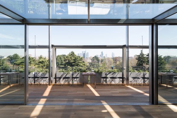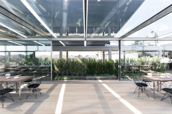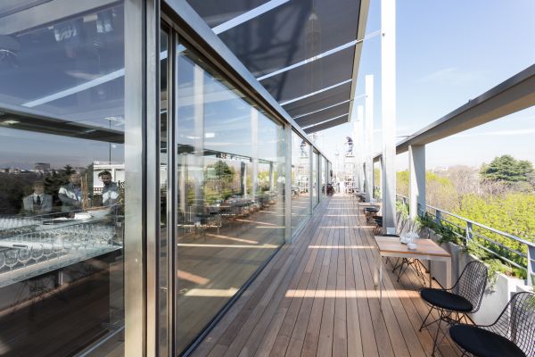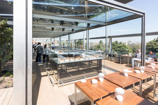 Nuovo ristorante sulla terrazza della Triennale Ideata e progettata dallo Studio OBR, e nello specifico dagli architetti Paolo Brescia e Tommaso Principi, il nuovo ristorante sulla terrazza del Palazzo dell’Arte rappresenta, insieme al Padiglione “Arts & Foods” a cura di Germano Celant, una delle più rilevanti iniziative della Triennale di Milano per Expo 2015. Dopo aver restaurato la terrazza panoramica sopra il salone d’onore secondo il progetto originario di Giovanni Muzio, la Triennale di Milano offre al suo pubblico una nuova dimensione di ristorazione di qualità, curata dallo chef stellato Stefano Cerveni. Da sempre le esposizioni della Triennale di Milano hanno definito una sintesi tra design e sperimentazione architettonica; in tali occasioni il parco si trasformava in un plateau teatrale dei nuovi miti per l’abitare urbano e l’edificio di Muzio diveniva un mirabile dispositivo di promozione culturale. Il progetto di OBR, vincitore del concorso d’idee indetto dalla Triennale di Milano nel luglio 2014, interpreta la tradizione della Triennale con una soluzione leggera, rigorosa e dinamica. Il ristorante è pensato come una serra trasparente immersa nel verde e sospesa sul Parco Sempione, con una vista spettacolare del Castello Sforzesco e dell’intero skyline di Milano. Salendo sulla terrazza del Palazzo dell’Arte, si viene accolti da un orto aromatico concepito dal paesaggista Antonio Perazzi, dietro il quale si articola il padiglione vetrato del ristorante, arretrato rispetto ai portali della facciata storica. “La Triennale è da sempre un riferimento della vita sociale e culturale di Milano. Il ristorante come serra sospesa tra parco e città nasce dall’idea di valorizzare la terrazza del Palazzo dell’Arte come luogo di forte socialità urbana, spazio sensibile in perpetua evoluzione che interagisce in virtù degli scambi dinamici tra interno ed esterno” (Paolo Brescia e Tommaso Principi). Il padiglione, completamente apribile su tutto il perimetro, è caratterizzato da una leggera struttura modulare in acciaio inox che consente un facile e veloce montaggio e smontaggio direttamente in situ, combinando tecnologie industriali con sapienza artigianale. Il disegno della struttura, ingegnerizzata da Buro Happold e Milan Ingegneria e realizzata dalla ditta Capoferri, riprende le geometrie delle campate storiche di Muzio. Una grande tenda mobile di 400 metri quadri fluttua sospesa sopra il padiglione vetrato. Aprendosi completamente su un lato, essa fa funzionare il padiglione come una serra bioclimatica termoregolante, con modalità d’uso differenti tra giorno/notte ed estate/inverno, e permettendo agli ospiti di pranzare riparati dal sole o di cenare sotto le stelle. Come una videoinstallazione, la tenda sospesa sulla serra si anima di immagini e di luci studiate da Guido Bianchi, rimandando agli eventi promossi da Triennale per Expo e offrendo ai propri ospiti un’esperienza unica tra alta cucina e design, sospesa tra parco e città. Progetto Il padiglione è lungo 33 metri, largo 4,7, alto 3 e ha una superficie di circa 150mq. Posizionato parallelamente al prospetto sul parco Sempione ed arretrato di circa 3 metri dal perimetro dell’edificio, esso è caratterizzato da una leggera struttura modulare in acciaio inox costituita da sette campate modulari di 4,7 metri, seguendo lo stesso passo delle arcate dell’edificio storico disegnato da Muzio. Il perimetro del padiglione è completamente apribile sui quattro lati, mediante un sistema scorrevole sui lati lunghi e un sistema traslante sui lati corti. Nella sua configurazione aperta, il padiglione si presenta come un telaio metallico senza soluzione di continuità spaziale con la terrazza, non avendo più angoli che ne delimitano lo spazio. Essendo completamente vetrato anche in copertura, il padiglione è protetto da una grande tenda costituita da 8 moduli di 4,7 metri di larghezza e 10 metri di lunghezza, completamente avvolgibili su rulli motorizzati. Grazie all’uso dinamico e combinato della tenda e delle ante scorrevoli e traslanti, il padiglione diversifica il suo funzionamento seguendo le condizioni climatico-ambientali come una serra bioclimatica termoregolante, garantendo il comfort ambientale con il minimo apporto dei sistemi impiantistici e con modalità d’uso differenti durante il giorno e le stagioni. L’utilizzo della tenda mobile ombreggiante garantisce il controllo ambientale interno riducendo il surriscaldamento nei mesi estivi, oppure, avvolgendosi, favorendo l’apporto solare passivo attraverso l’irraggiamento solare diretto sulla copertura vetrata nei mesi invernali. Durante le mezze stagioni è prevista l’ottimizzazione della ventilazione naturale attraverso le generose aperture vetrate su lati contrapposti. Se di giorno la tenda assume una valenza prevalentemente energetico-ambientale, di sera essa diventa diffusore luminoso o videoinstallazione animata da proiettori posizionati all’esterno e sincronizzati tra loro. Tra il padiglione e la pensilina esistente si articola un orto aromatico che funge da buffer ambientale che accompagna l’ospite verso l’ingresso del ristorante lungo il porticato esistente. La geometria del padiglione individua chiaramente tre aree funzionali: l’area di accoglienza con il bar panoramico all’estremità sudorientale, l’area dello show-cooking all’estremità nord-occidentale e l’area da pranzo al centro con diverse possibili configurazioni in funzione della flessibilità richiesta da performance ed eventi temporanei. Secondo questo approccio, il padiglione si propone come spazio sensibile in perpetua evoluzione, che interagisce in virtù degli scambi dinamici tra interno ed esterno. Consiglia questo progetto ai tuoi amici Commenta questo progetto
