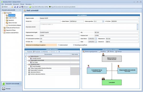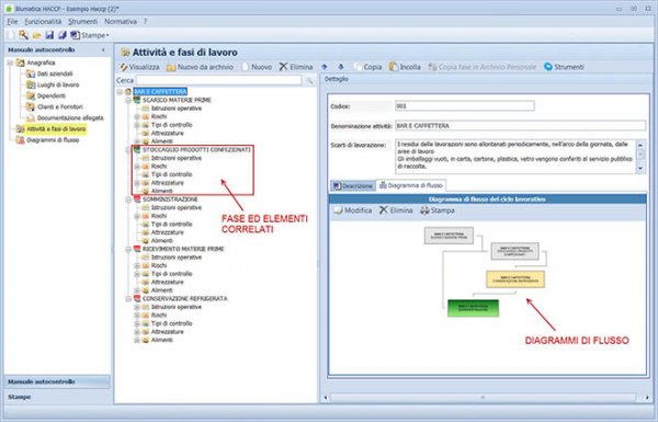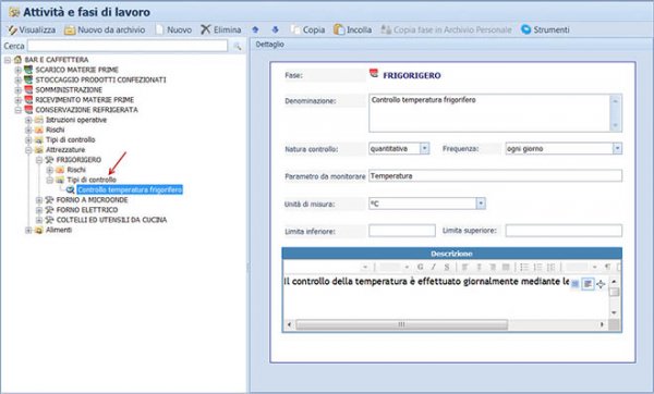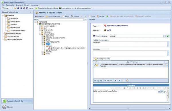 • Disponibilità di una vasta banca dati di attività lavorative con collegamenti precostituiti a fasi, attrezzature, alimenti, rischi, prevenzioni, azioni correttive, limiti critici, processi e tipologie di controllo