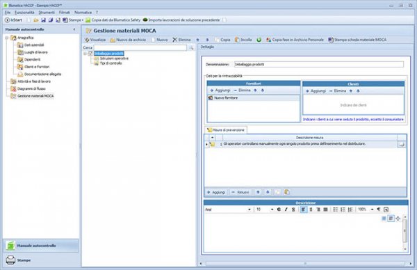 • Gestione di materiali ed oggetti destinati a entrare in contatto con gli alimenti (MOCA). È possibile selezionare materiali ed oggetti dall’archivio del software, indicare le misure di sicurezza attuate e mantenere traccia di fornitori e clienti a cui viene ceduto il prodotto. Sono disponibili archivi specifici relativi a materiali e oggetti attivi, materiali e oggetti intelligenti, colle, ceramiche, sughero, caucciù, vetro, resine scambiatrici di ioni, metalli e leghe, carta e cartone, materiali plastici, inchiostri di stampa, cellulose rigenerate, siliconi, tessili, vernici, rivestimenti, cere, legno